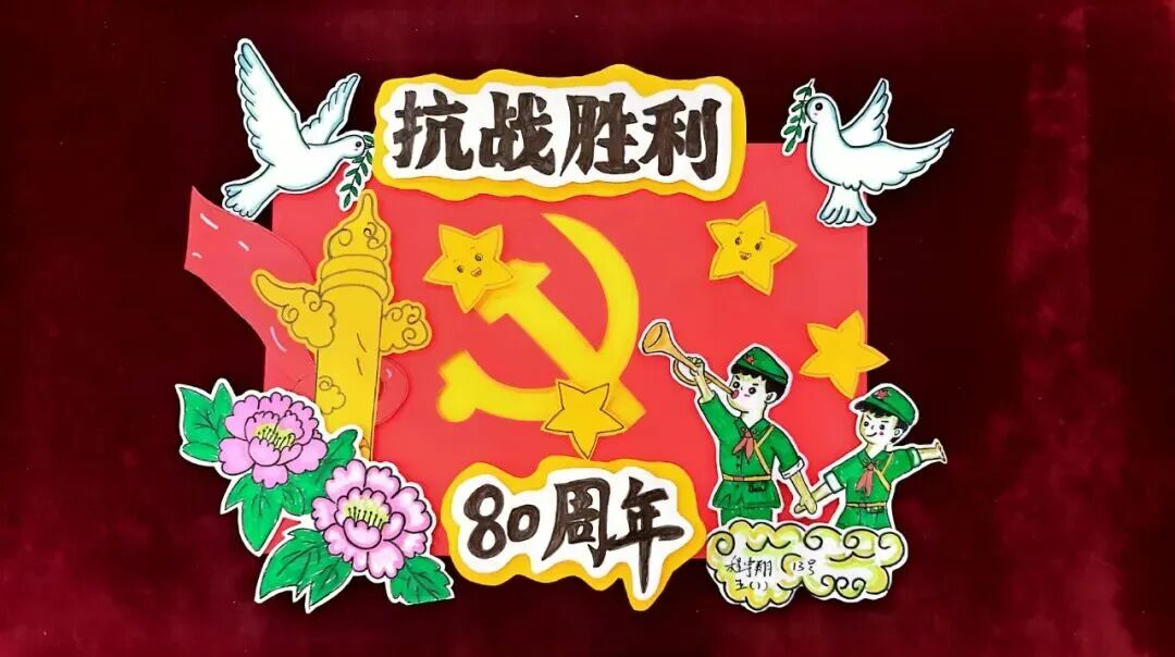 这幅画是为了纪念抗战胜利 80 周年而创作的。画面中间有代表党的镰刀锤子标志,周围还有可爱的星星。左边写着 “80 周年”,右边写着 “抗战胜利”,能让大家一下子就知道这幅画的主题。