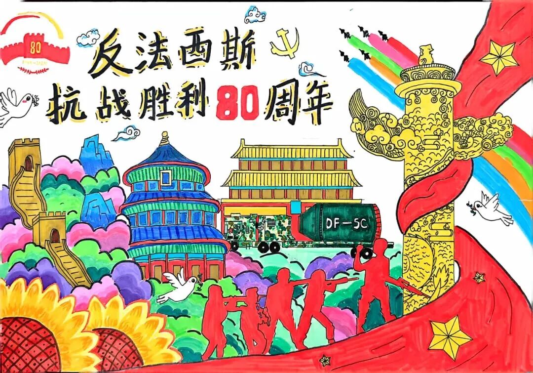 这幅画以“反法西斯抗战胜利80周年”为主题,融合长城、天坛、天安门等地标,搭配军人剪影、东风导弹车、华表与和平鸽,用丰富色彩展现抗战历史记忆与当代国防力量,致敬胜利与和平。