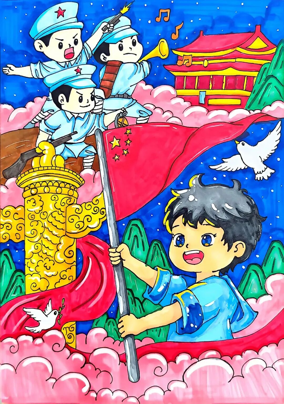 这幅画以红色爱国主题为核心,采用色彩浓烈、形象卡通的表现风格。画面元素丰富且具有鲜明的象征意义:画面上方是三位身着蓝色军装、佩戴红星帽徽的红军战士,有的冲锋呐喊,有的吹响号角,再现了革命先辈奋勇拼搏的场景;中间是一位手持五星红旗的当代儿童,眼神明亮、笑容灿烂,象征着新一代对国家的热爱与传承;背景中,红色的天安门建筑庄严肃穆,金色华表尽显民族特色,绿色山峦、粉色祥云营造出祥和氛围,白鸽与音符则传递出和平与希望的愿景。整体画面将革命历史、国家象征与当代少年形象融合,构图饱满且富有层次。