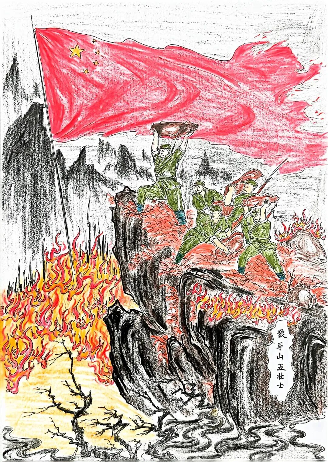 这幅画以“狼牙山五壮士”为主题,画面展现了五位壮士在狼牙山主峰的英勇姿态:他们身着军装,高举石块或持械备战,背景是猎猎飘扬的五星红旗,山间烈火熊熊,山石巍峨冷峻。画面右下角的“狼牙山五壮士”题字点明核心内容,整体用色对比强烈,红色的旗帜、火焰与灰黑的山石、背景形成视觉冲击,突出场景的悲壮与激昂。