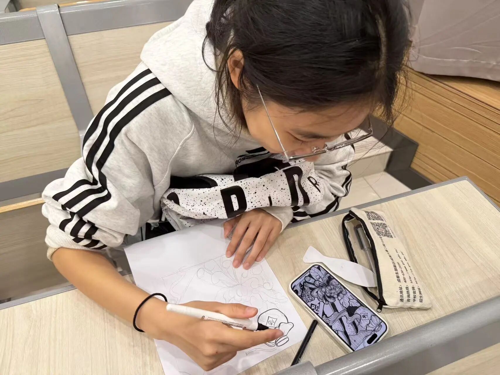 活动过半,一场“无主题分享”悄然展开。有人举着刚画完的画走到人群中:“这是我爷爷,他去年重阳还带我爬了山,今年我用画把那次经历记下来”;有位同学展示着画里的“跨屏祖孙”:“爸妈说爷爷奶奶看到我画的重阳图,在视频里笑个不停”没有评判,只有倾听与共鸣,让孝心在交流中悄悄升温。
