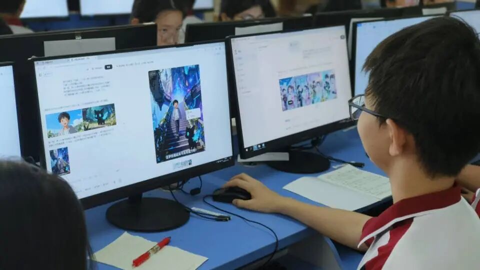 各年级学生紧密围绕专属主题,以AI技术作为创作辅助工具,勾勒出独具特色的故事画卷。七年级学生运用生动笔触,再现了课间嬉戏、运动会拼搏等校园场景;八年级学生聚焦星际旅行、智能生活,《太空课堂》《环保机器人》等作品将科幻想象与现实思考进行了巧妙融合;九年级学生深入挖掘文化内涵,以新颖的AI画风演绎经典,使传统文化焕发出新的生机。在创作过程中,同学们在信息技术和美术教师的指导下,熟练运用AI工具对画面进行优化、对情节进行串联,实现了创意与技术的完美融合。
