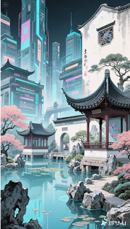 作品简介:画面以吴韵意象中的园林建筑为主题,以苏州园林为代表,如拙政园、留园等,亭台楼阁、假山池沼、花草树木与现代高楼大厦建筑相结合,采用融合现代赛博朋克风与传统水墨画风格的手法,使画面传达出既有未来科技感又不失东方韵味的视觉感受。