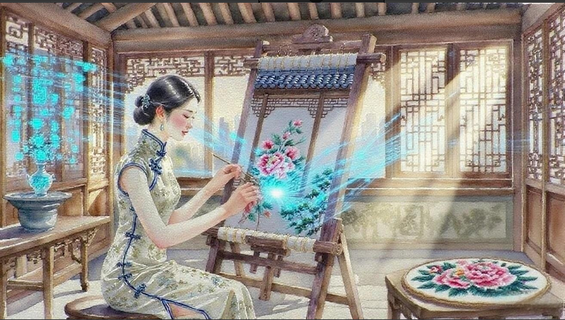 作品简介:《吴韵•数据绘》是一场跨越时空的对话。我以算法为笔、数据为墨,重新描绘江苏千年吴韵的灵秀与风雅。画面中,绣娘手中的光纤维正将苏绣中的经典刺绣——花用数字流为丝线勾勒,隐喻传统文化在智能时代的“活化”与新生。作品旨在探索AI不仅是工具,更是赋予传统全新表达维度的媒介,让深厚的地域文化在数字维度下绽放出超越想象的未来之光。