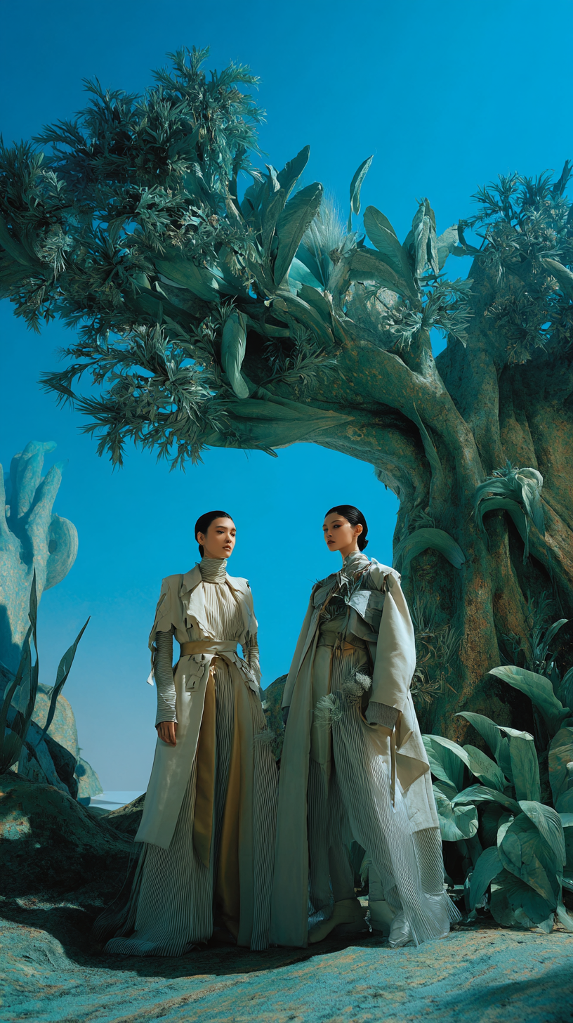沙漠景观中的超现实时尚编辑,两个优雅的女模特站在超大的绿色奇幻树中,雕塑般的有机植物,梦幻般的环境,明亮色调的高级时装服装,长外套和有质感的面料,前卫的奢华运动风格,清澈的蓝天,电影般的日光,艺术构图,概念摄影,超细节,逼真