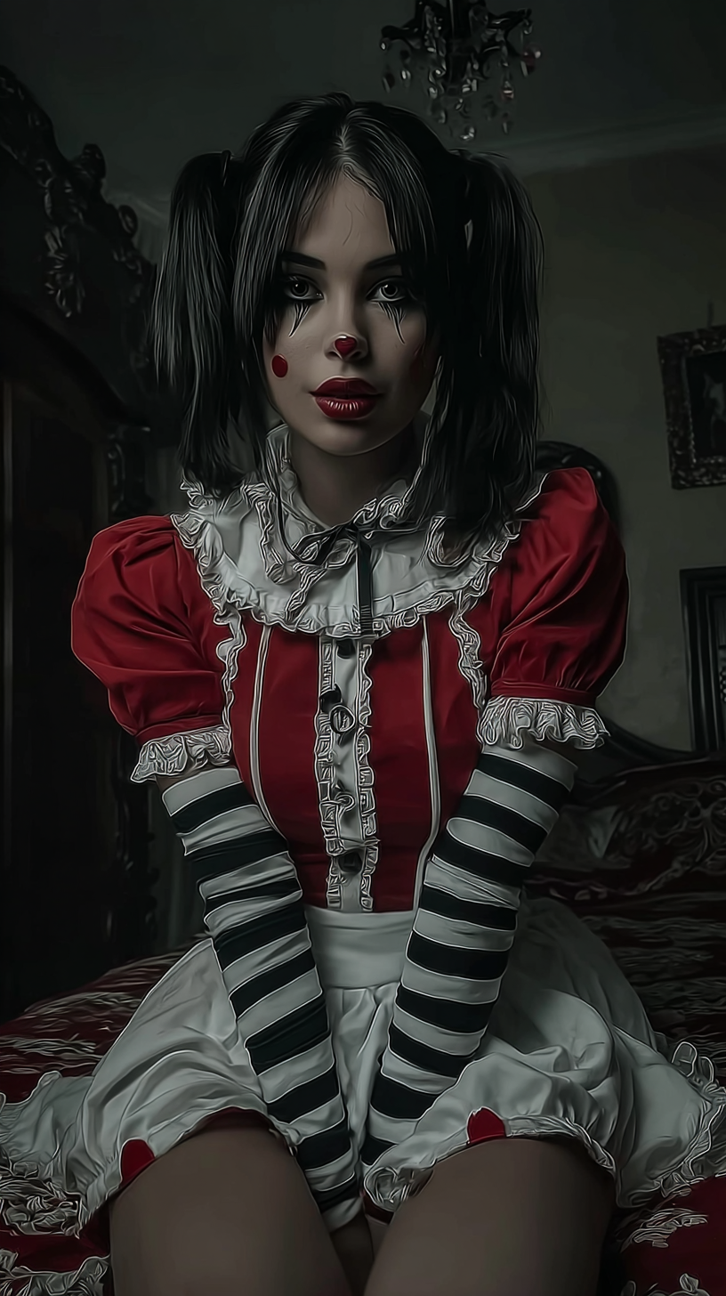 一位身穿红白相间的女小丑,双手戴着黑色条纹手套,盘腿坐着,穿着优雅的白色紧身裙。她的脸画得像小丑的经典妆容,蓝眼睛下有黑眼圈,脸颊红润,黑发鲍勃头。背景是一个光线昏暗的房间,营造出一种神秘的氛围。全身照,摄影风格。暗哥特风格