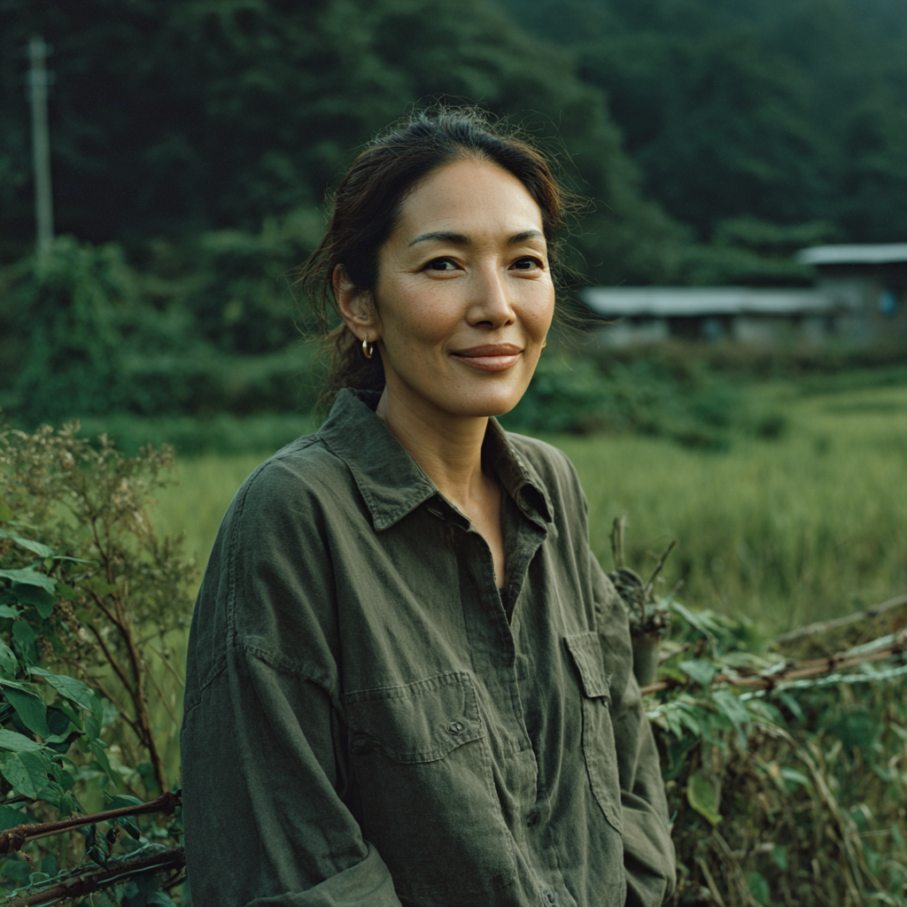 女模特,40岁出头,轻松自然美丽,站在郁郁葱葱的田野里,穿着一件运动衫(Gildan 18000),运动衫的颜色为藏青色,衬衫正面清晰可见,平整无皱纹或褶皱,款式为牛仔布或裙子,极少的配件,自然化妆,头发整齐地塞在肩膀后面或系在后面,完全暴露衬衫,表情坦率,在栏杆附近拍照,心情平和,柔和的自然光,现代生活方式摄影,没有标志,没有文字。清洁和信仰向前的能源