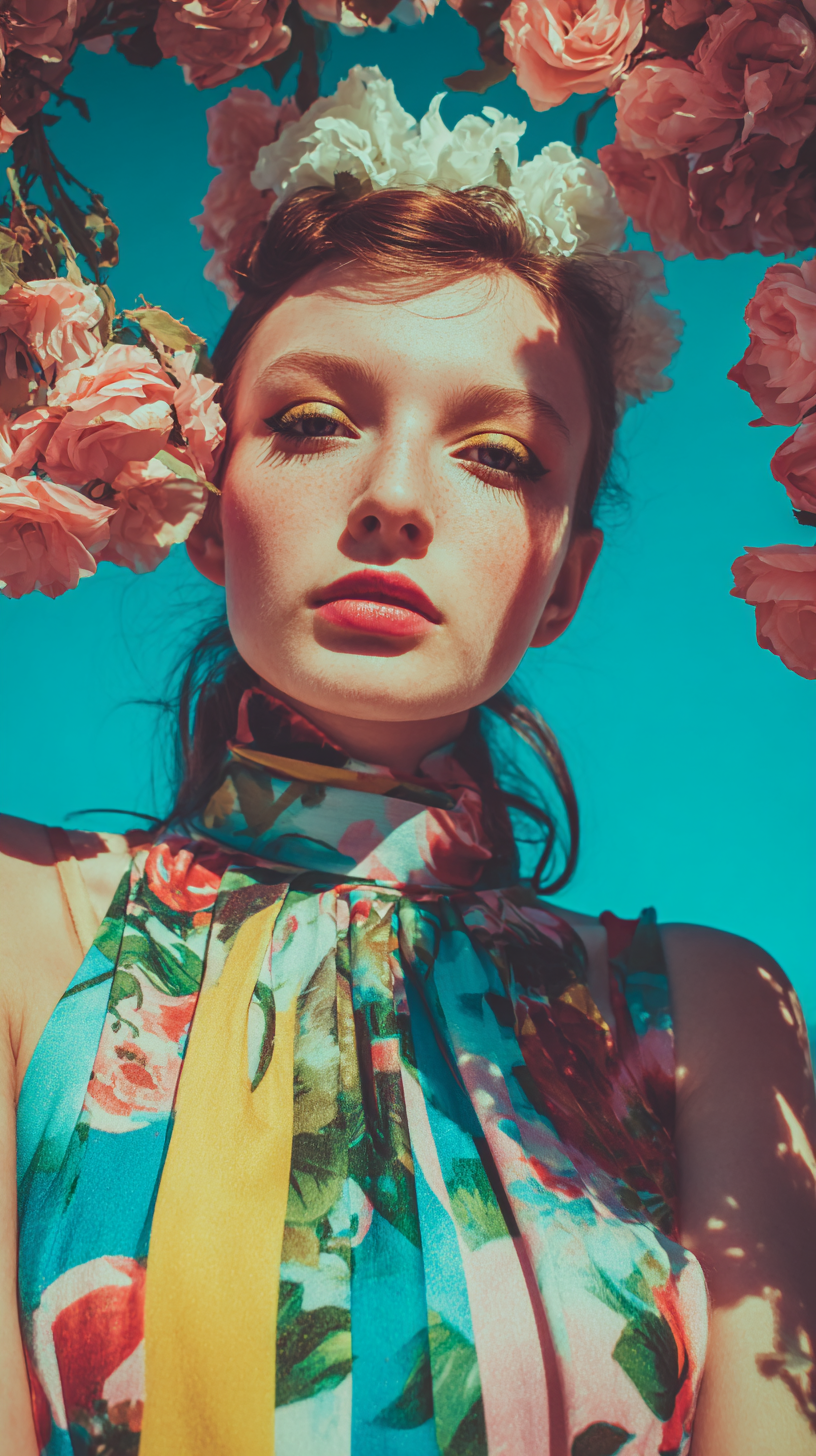一个美丽的女人,头发上戴着白花,穿着蓝色、黄色、红色和绿色的衣服,带有超现实主义的塔西拉·阿马拉尔风格。太阳透过画在帆布上的粉红色星尘云照耀着。这是一幅杰作,具有瓦西里·康定斯基和亨利·马蒂斯的风格,以蓝色、石灰绿和珊瑚色为特色。