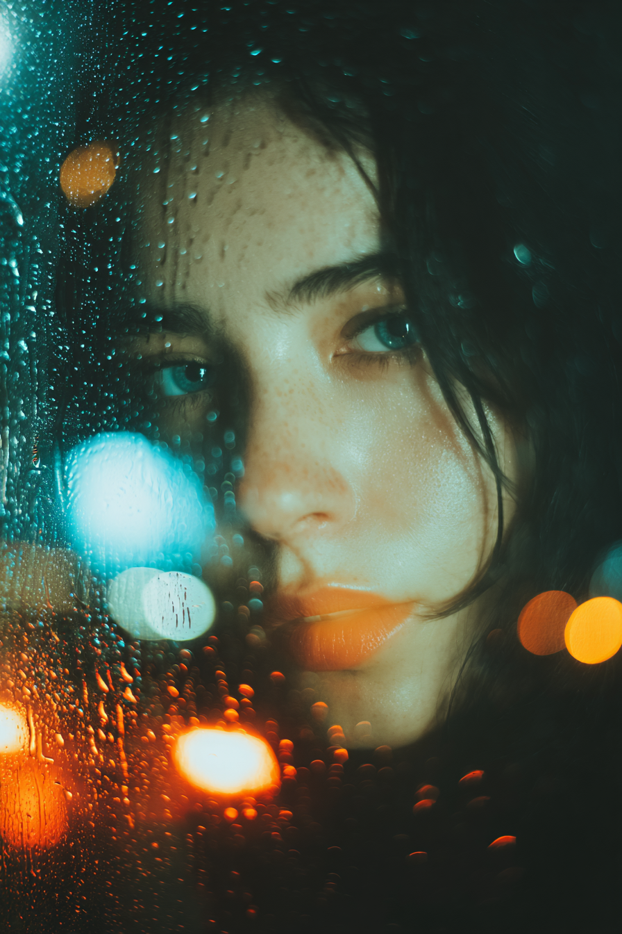 超现实的超现实主义艺术,悬浮在空中的雨滴形成女性的轮廓和面容,没有清晰的特征,低语的呼唤,每一滴内部的光,黑暗的夜晚气氛,潮湿的沥青反射,电影般的灯光,深沉的情感,沉默和渴望,超细节,3D深度,戏剧性的对比,诗意的忧郁,杰作,没有文字