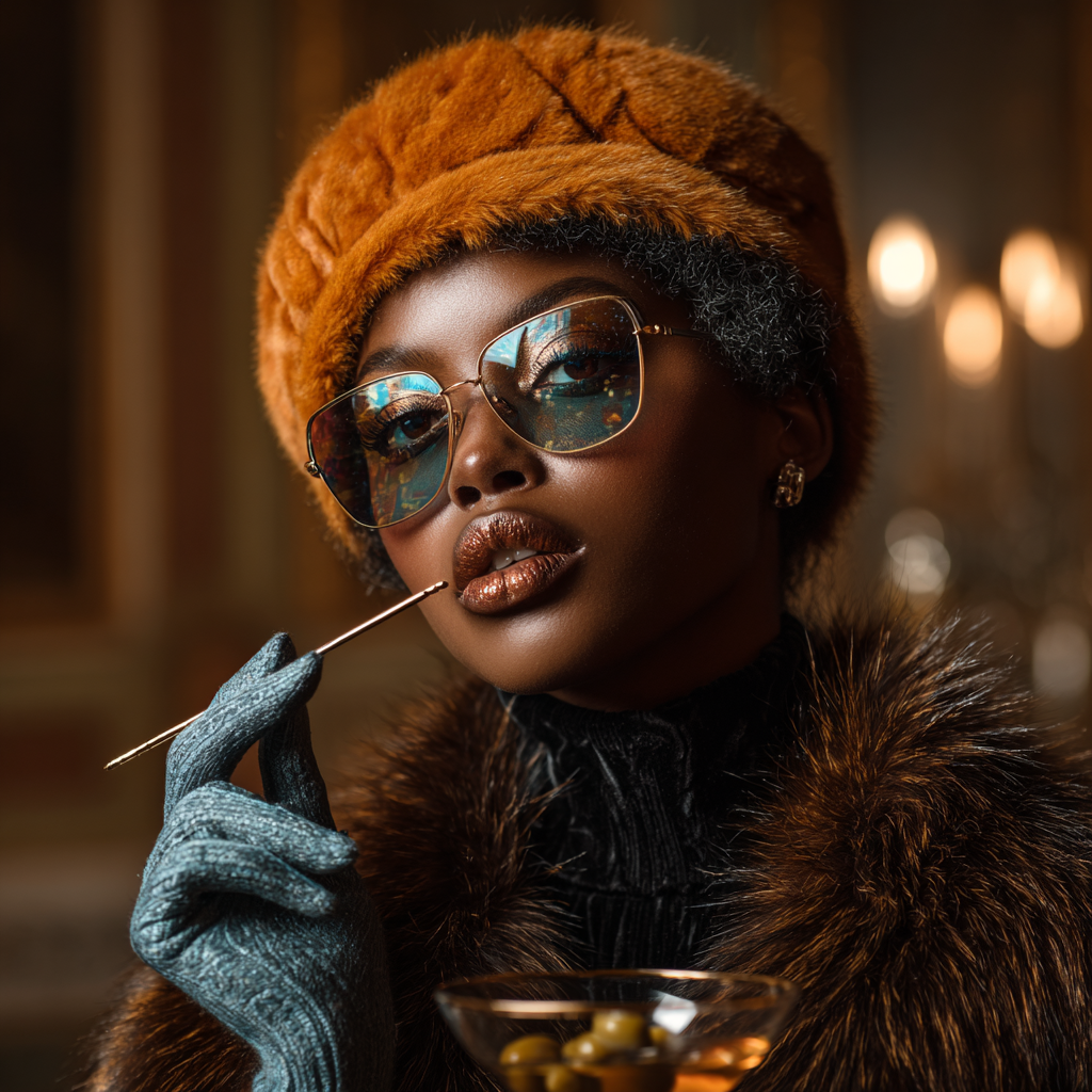 想象一下,一个漂亮的黑人女性,只有脸部特写,戴着一顶橙色的毛皮帽子,穿着一件毛皮大衣,戴着非常反光的镜面护目镜。女人有雀斑。在镜子的倒影中,你可以看到一个戴着钴蓝色手套的女人,一只手拿着马提尼酒,另一只手拿着牙签上的橄榄。背景是一个优雅的俱乐部设置。MJ中文版效果图: