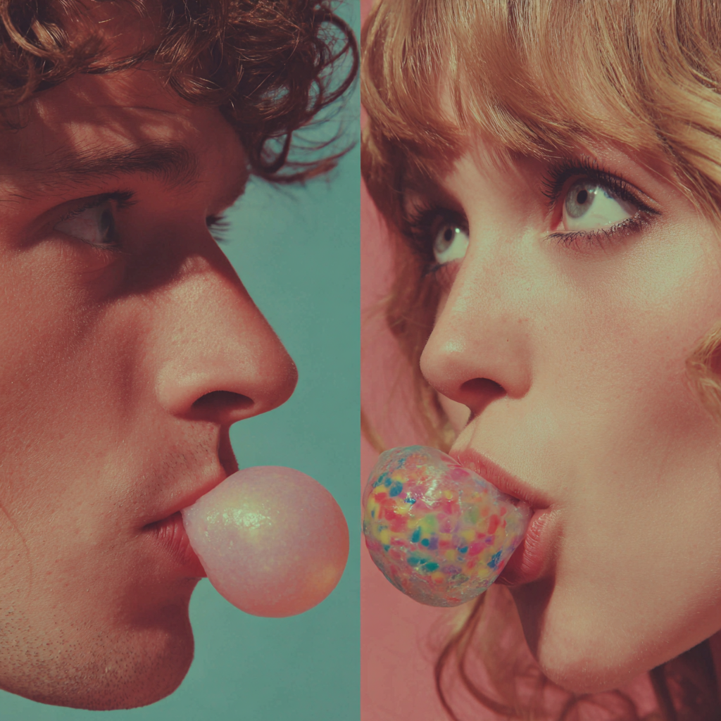 两个人,一男一女,特写镜头,他们的脸占据了画面的大部分,侧面侧面对着对方,两人都在吹泡泡糖,他们的泡泡糖在中间粘在一起,他们的嘴之间相连,震惊和惊讶的面部表情,大大的眼睛,冻结的反应时刻,卡通风格的插图,可爱和顽皮的情绪,明亮多彩的色调,生动的柔和的颜色,干净的轮廓,柔和的阴影,异样和可爱的气氛。