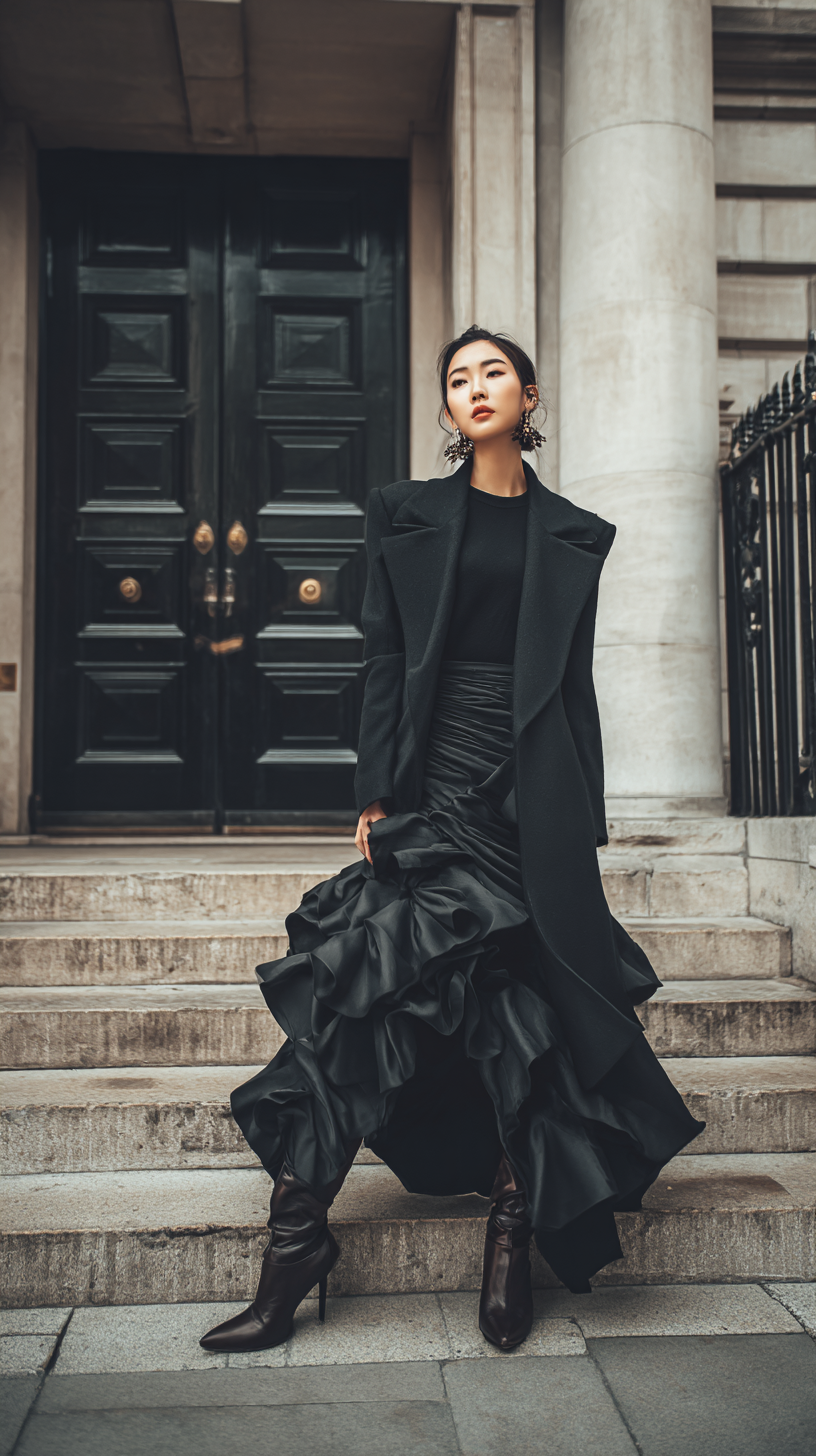 一个女人站在欧洲城市的石阶上,站在高大的黑色经典木门前--轻松的街头风格姿态,重心移到一条腿上,头转向左边--及地的超大象牙色定制大衣,夸张的肩部张开,及地的高度不对称的象牙色褶皱连衣裙,裙子下摆下可见的棕色皮革阔腿靴,黑色皮手套,最小的珠宝--全身拍摄,与眼睛平视的角度,时尚街拍取景。静态相机-自然日光与柔和的对比,现代都市时尚氛围-超现实主义,ARRI Alexa 65, 8k