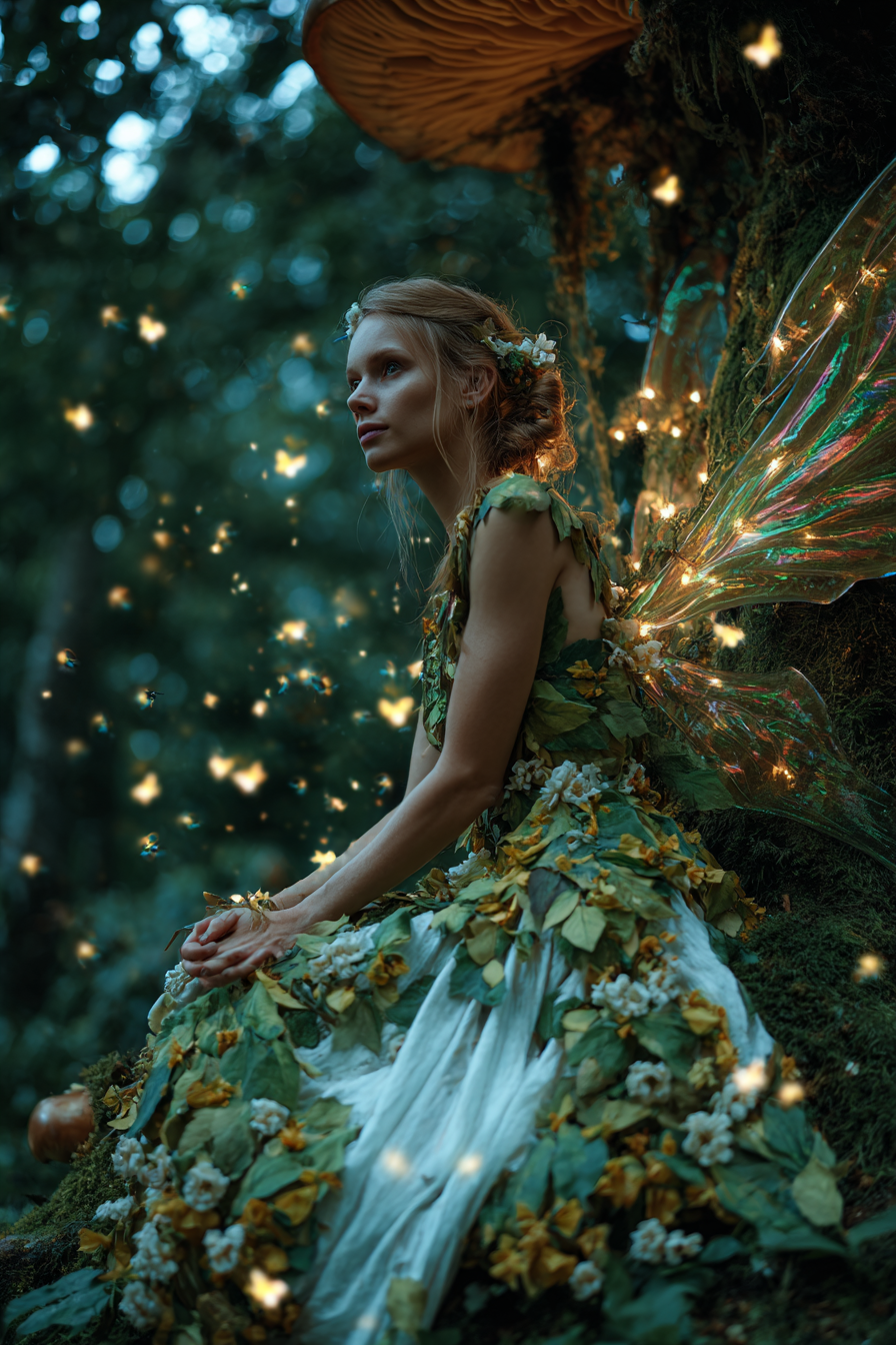 一个美丽的仙女,长着彩虹色的翅膀,坐在森林里的一棵古老的蘑菇上。她皮肤白皙,金色的长发松松地扎在脑后。她的衣服是用树叶做成的,是绿色和白色的,上面装饰着花朵。萤火虫和发光的小灯在她周围飞来飞去。幻想画家风格的现实主义绘画。