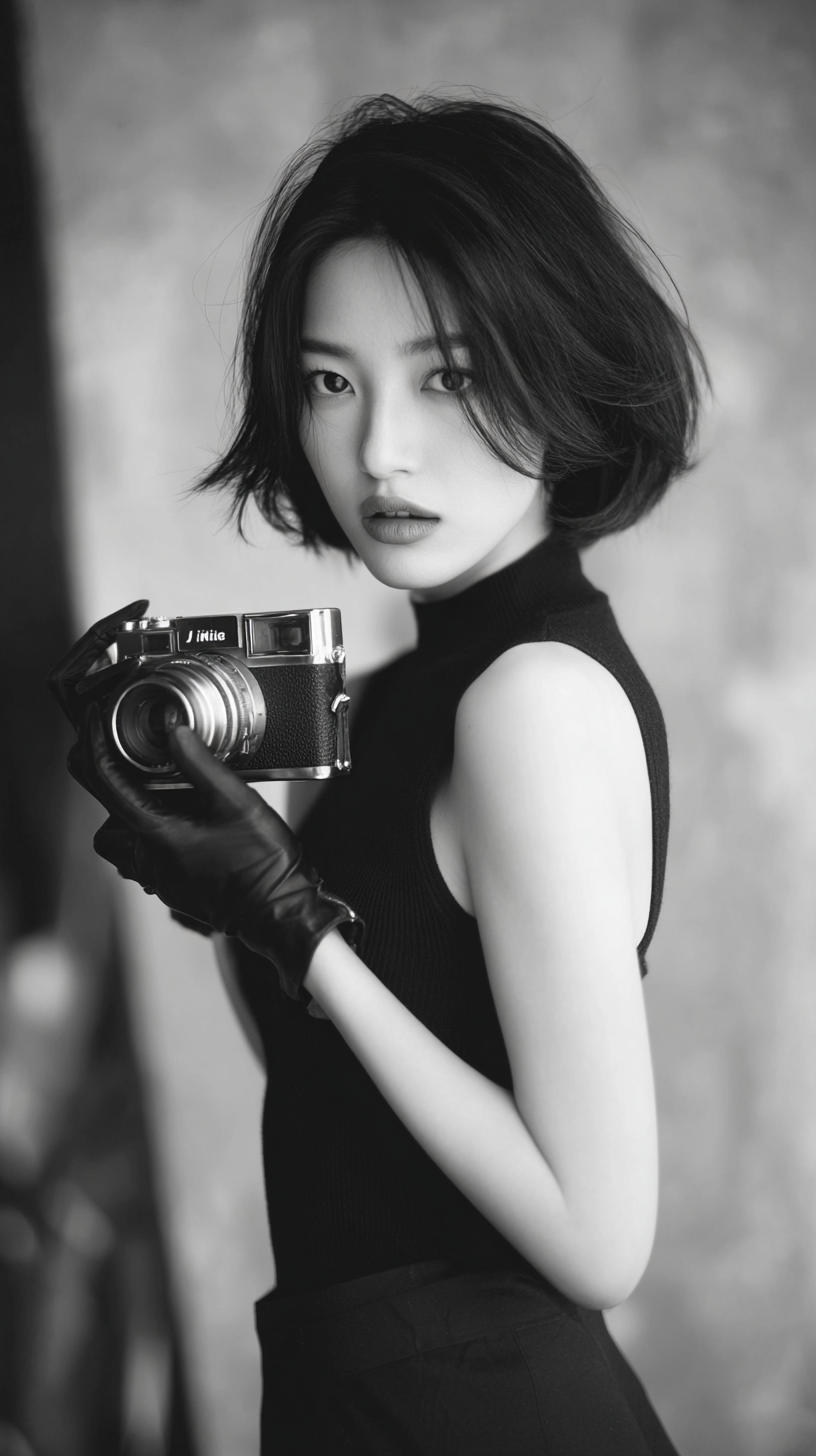 一个美丽的金发模特,短发和刘海,穿着无袖上衣,戴着黑色皮手套,拿着徕卡相机在她的面前,为时尚杂志摆姿势。这是一幅黑白摄影作品。
