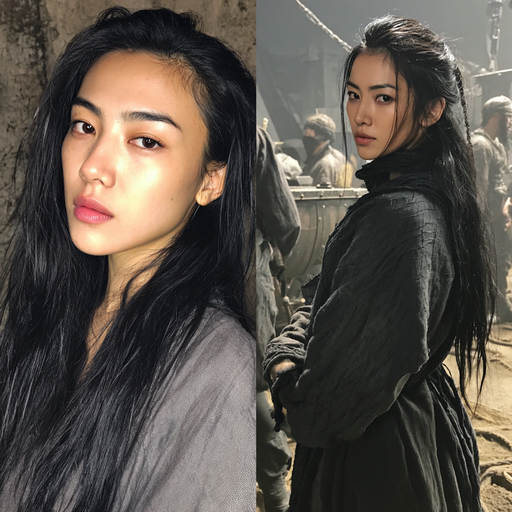 逼真的亚洲女孩,黑色长发,美丽的圆脸,樱桃嘴唇。她的皮肤偏棕色。训练有素的工作人员。在一个低科技的科幻背景下,穿着亚麻床单和打暖衣,背景是蒸汽腾腾的机械车间。光秃秃的脑袋,长长的黑发尾巴。疲惫而现实的眼睛。Midjourney绘画生成的效果图: