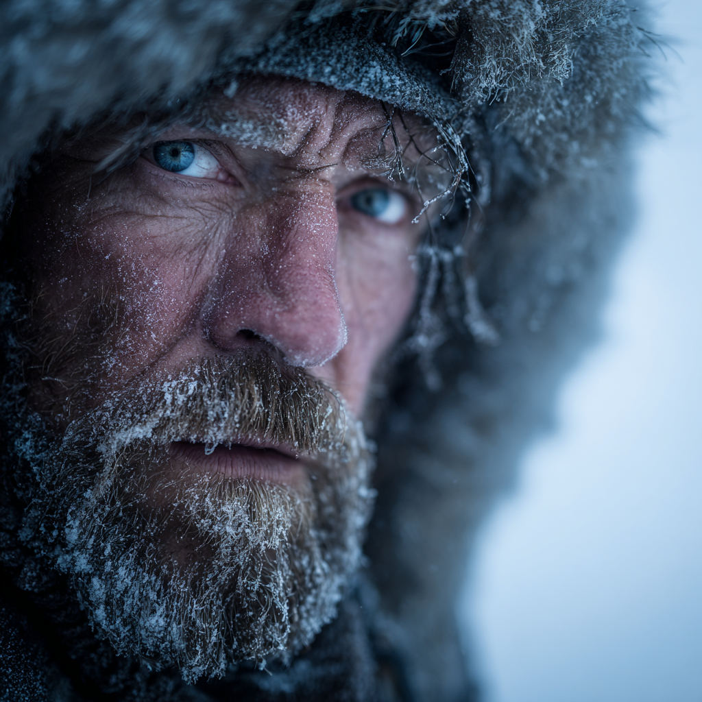 超现实的电影特写,一个粗犷的男人在极端的北极寒冷中生存,锐利的冰冷的蓝眼睛直视着镜头,冰雪覆盖了胡须、眉毛和睫毛,饱经风霜的皮肤破裂,强烈的情感表达,穿着厚厚的毛皮连帽外套,冰冻的呼吸可见,戏剧性的冬季气氛,冷蓝色的色彩渐变,高对比度的照明,浅景深,对眼睛的超锐利聚焦,细致的皮肤纹理,空气中的雪颗粒,情绪化的电影照明,8K分辨率,逼真,RAW照片,电影构图,史诗般的生存氛围。