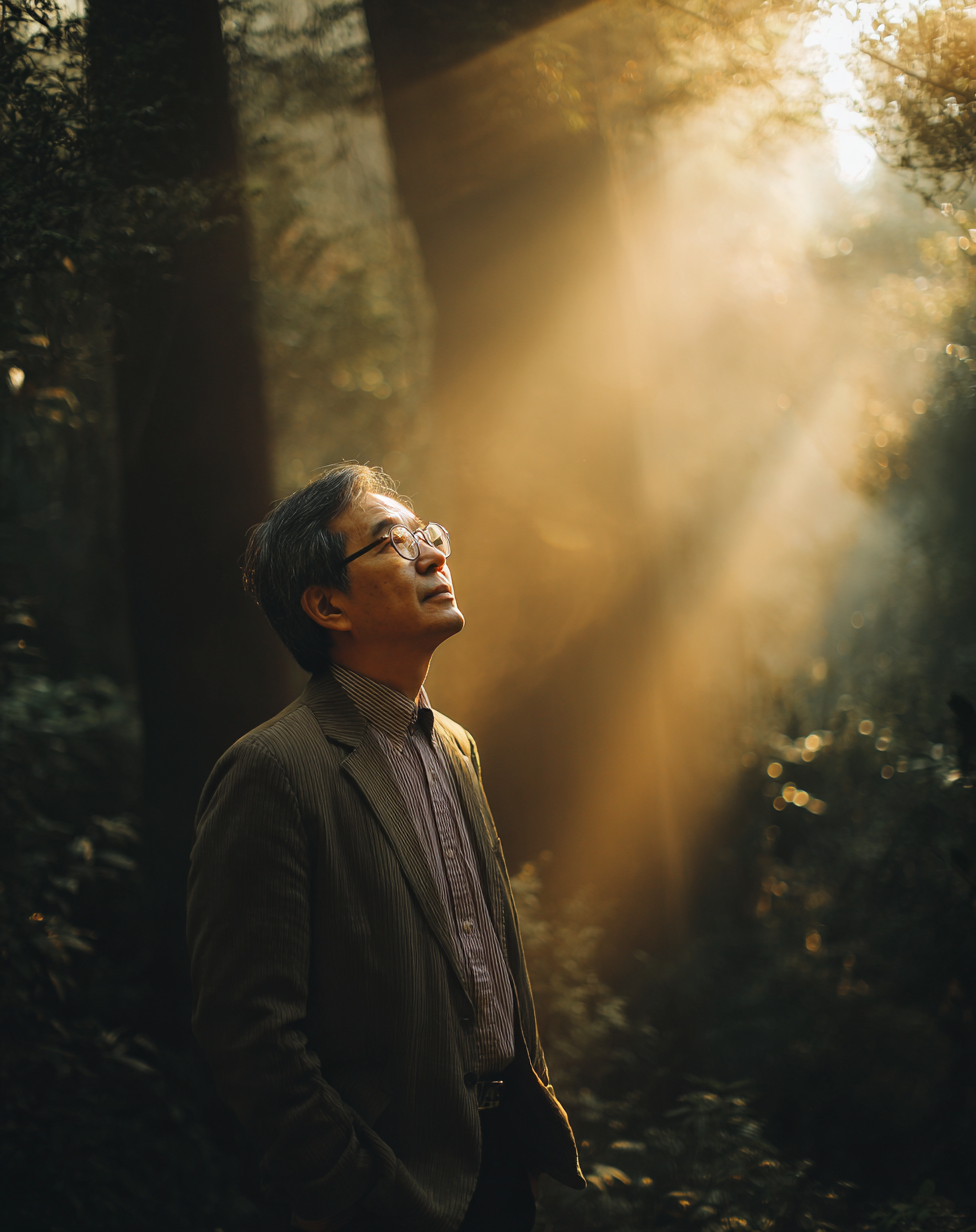 大沙色头发的中年男子,眼镜,穿着非常漂亮的衣服,独自站在森林的边缘在黄金小时,柔和的阳光过滤通过高大的树木,神的爱照耀明亮的光线穿过云层和金色尘埃漂浮在空中,阳光通过树倒,让人知道他是爱上帝,双手放松在两侧,向上看,没有可见的行动,只是存在,大气中细微的光芒,自然的颜色,逼真,电影写实,浅景深,平和的情绪,完成感和安静的理解,没有符号,没有光环,没有宗教意象,没有文字,柔和的灯光,详细的水墨绘画,高质量