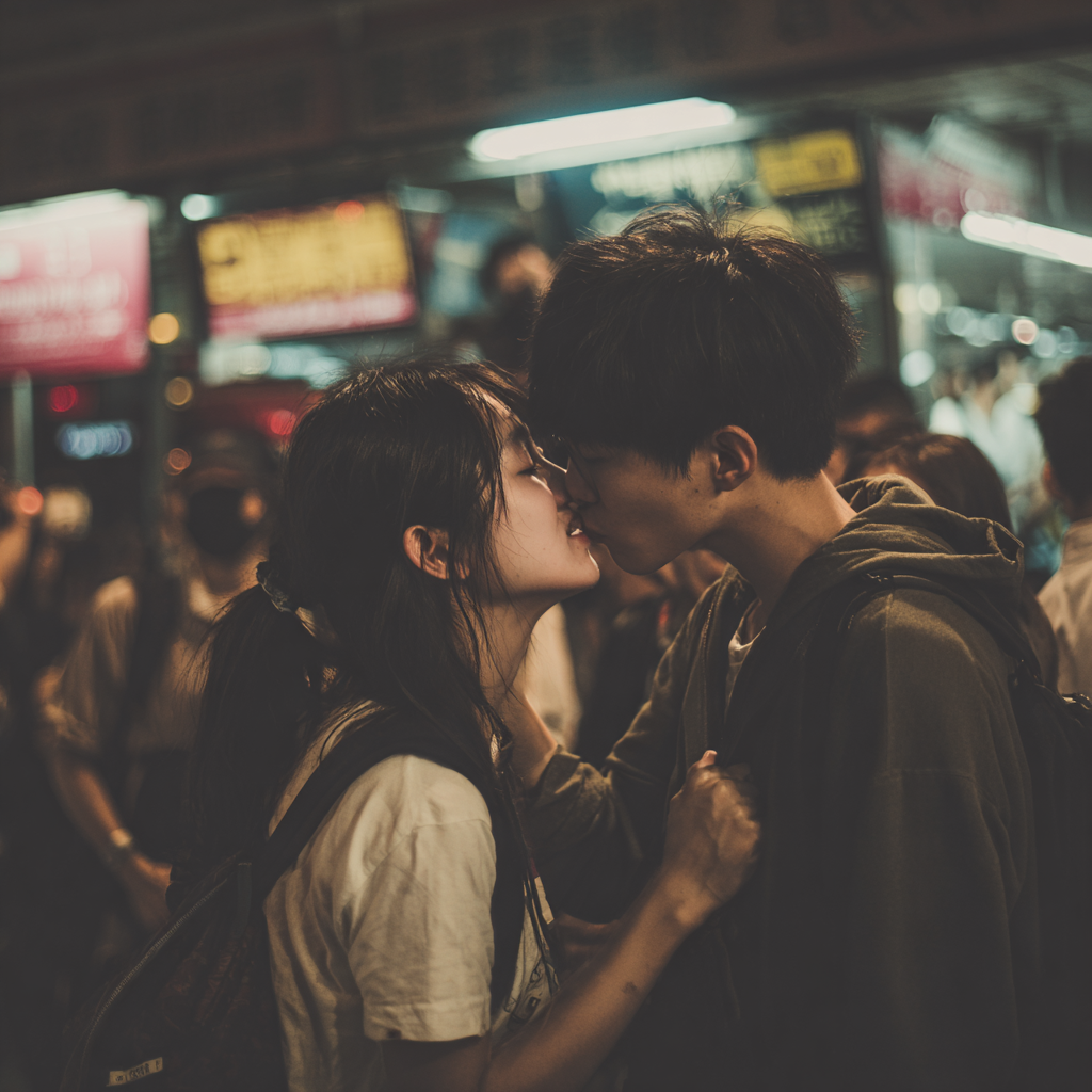 在一个地铁站里一个女生仰着头手捧着男生的脸,男生脸上洋溢着幸福,随后吻在了女生的嘴唇上,周围都是人在起哄和牌照,写实风格。