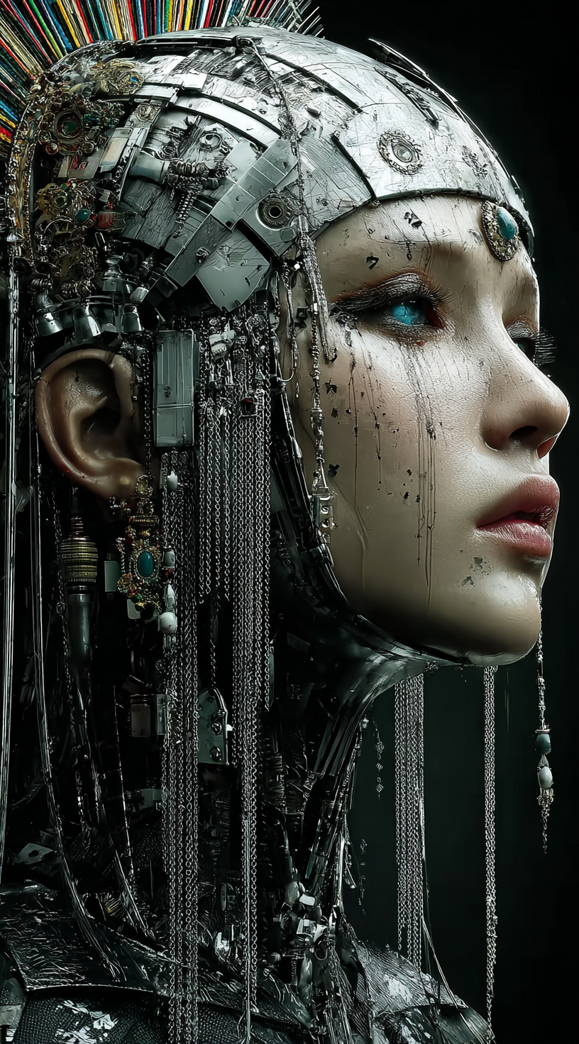 一位美丽的机器人女孩,由银与玻璃打造,头戴古埃及风格的头饰,整体风格融合了塔罗·冈本、让-卢普·西耶夫以及古斯塔夫·克里姆特的特色。这尊雕像闪耀着金属光泽,呈现出浓郁的东方主义美学,颈部点缀着精美的珠宝。她的眼睛散发着鲜艳的蓝色光芒,人物形象以特写、高分辨率且细节极为丰富的形式呈现。