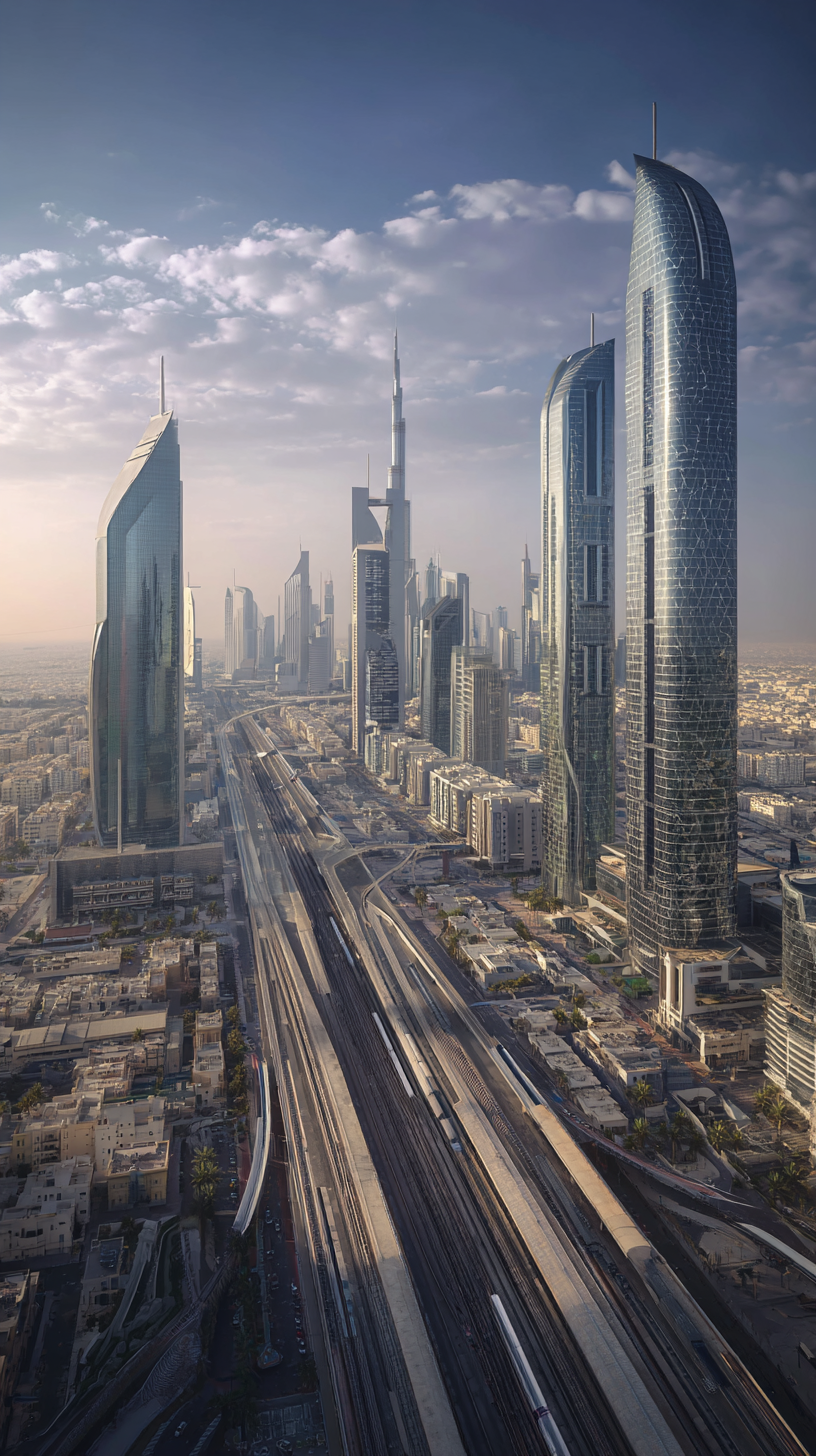 一张超逼真的航拍照片(不是CGI),捕捉了两个由中央高速铁路线无缝连接的真实中东城市。右边是沙特阿拉伯利雅得的真实天际线,展示了王国塔,Al Faisaliah塔和KAFD塔,所有这些都以真实的摄影现实主义呈现。在左边,卡塔尔多哈的真实天际线,包括西湾塔,Aspire塔(多哈火炬)和龙卷风塔,都清晰可见,真实的形式。现代铁路完美地贯穿中心,笔直而对称,连接着两座城市的天际线。下面的地面是城市铺砌的街道,干净的基础设施,没有沙漠,没有空旷的土地,创造了两个城市形成一个连续的大都市区的错觉。拍摄角度:空中俯视(≈45°倾斜),电影视角与深度和水平对齐。灯光:早晨明亮的阳光,自然的蓝天,柔和的大气雾为深度。风格:超现实摄影,尼康D850或佳能EOS R5外观,清晰的玻璃反射,HDR色调,8K细节,垂直格式(9:16)。没有汽车,没有人,没有未来主义或艺术效果,纯粹的现实主义。