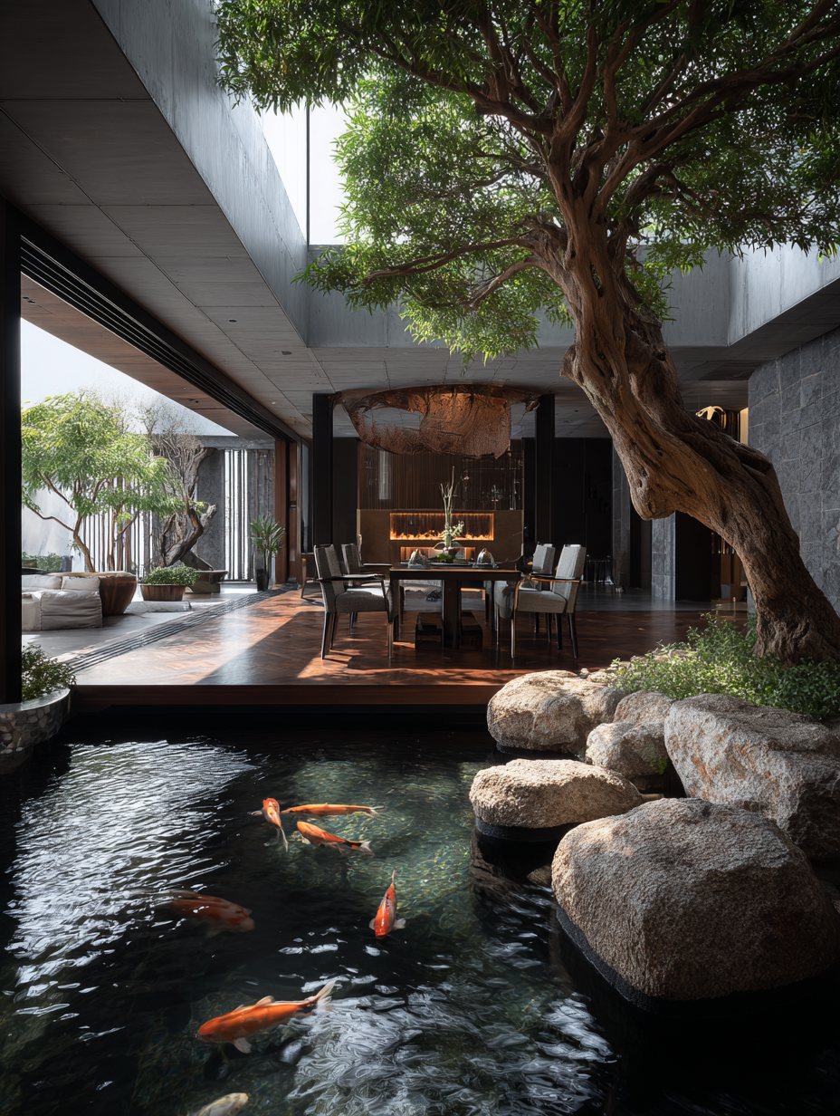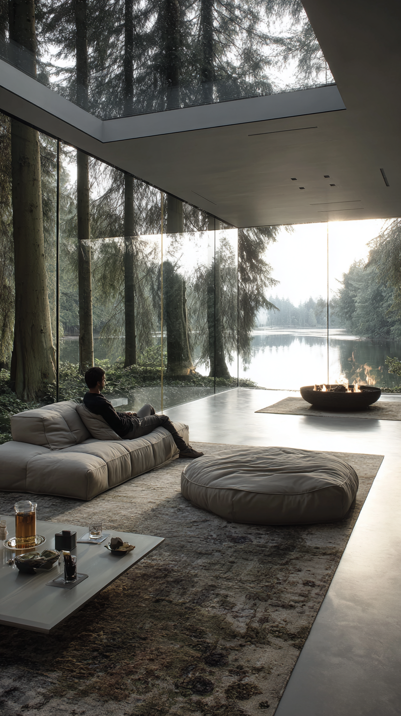 一个豪华的现代客厅与地板到天花板的玻璃墙提供全景的森林和一个宁静的湖泊。一张低矮的、模块化的米色沙发正对着风景,一个人坐在沙发上凝视着窗外。室内包括一个大的有纹理的区域地毯,一个圆形的奥斯曼,和一个光滑的咖啡桌,上面装饰着饮料和配件。在玻璃墙外,一个现代风格的火坑坐落在被高大树木环绕的露台上。设计是极简主义和优雅的,温暖的集成天花板和地板照明,创造一个舒适,诱人的氛围。建筑强调开放、透明和与自然的和谐,将现代奢华与宁静的自然环境融为一体。超现实,高细节,建筑可视化,电影照明