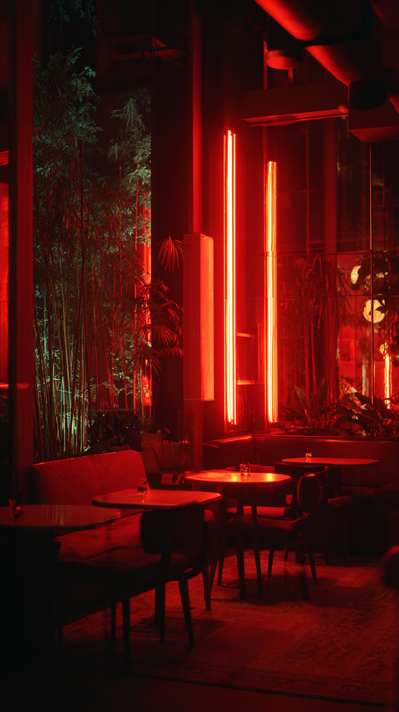 电影般的夜总会休息室沐浴在充满活力的红色霓虹灯下。一群群时髦的朋友坐在光滑的桌子旁,端着闪闪发光的鸡尾酒,谈笑风生,而就在他们身后,其他人随着音乐随意地跳舞。这个空间感觉很平衡——不太狂野,也不太安静——是社交和活力的完美结合。镜头在房间里流畅地滑动,捕捉到亲密的对话和有趣的舞蹈,超高饱和的霓虹灯色彩和电影般的氛围。