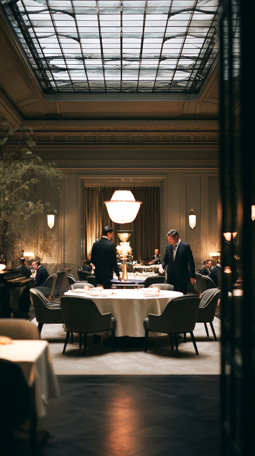 法国兰斯一家米其林星级餐厅的中心,一幅电影般的照片。香槟的氛围。明亮的光。原始的,真实的照片,一个豪华的新古典主义餐厅在一个高档餐厅或酒店,光,阳光直射,一盏灯:整个餐厅沐浴在柔和的,情绪化的光芒。一张圆桌矗立在精致的聚光灯下,完美的设置却未被触动,象征着潜力和精确。在它周围,穿着优雅的食客和细心的工作人员模糊的动作暗示着一个繁荣,精致的氛围。客人们走向桌子。由工作人员邀请。现场融合了极简主义的法国优雅与一个诱人的,动态的能量,巧妙的设计和成功的操作之间的完美平衡