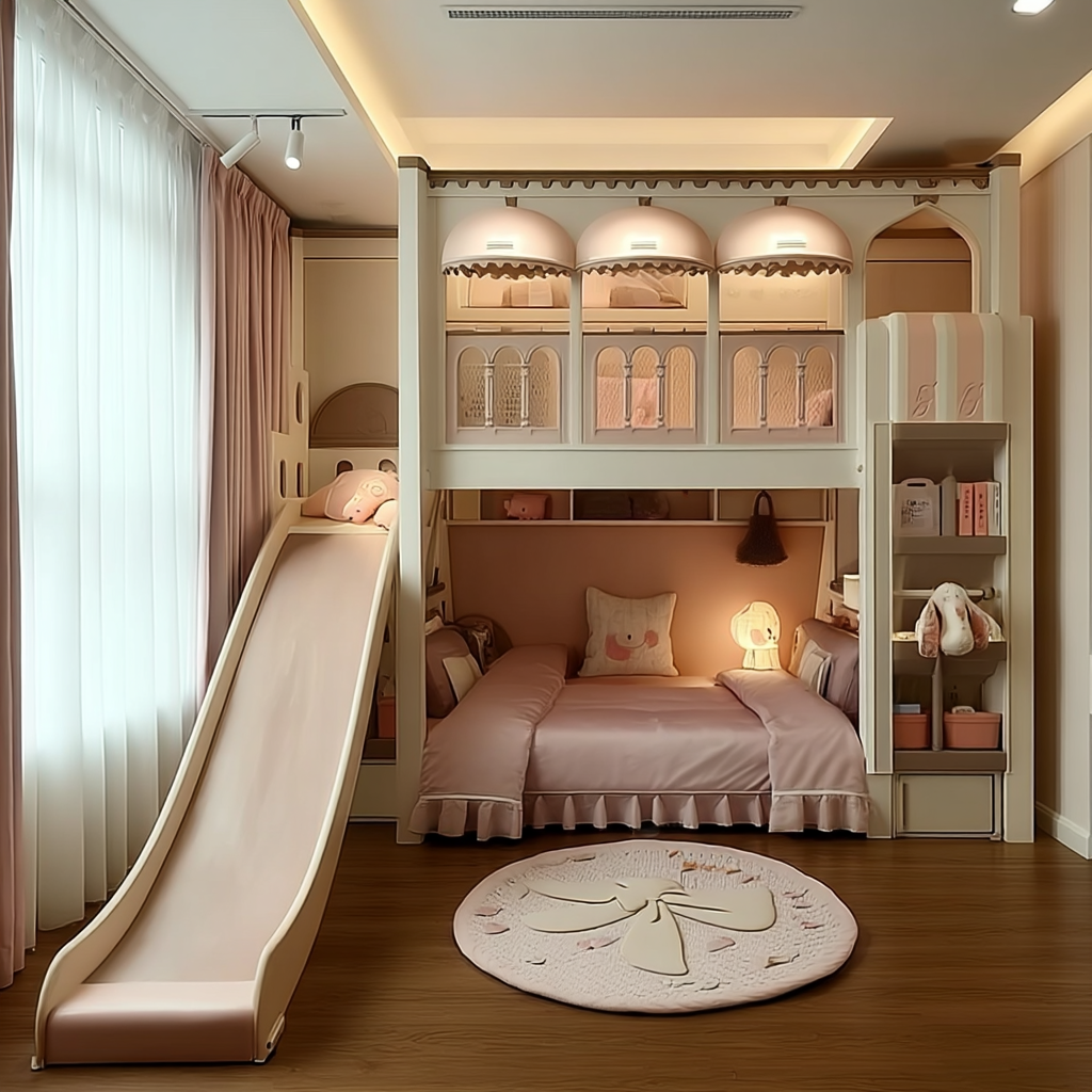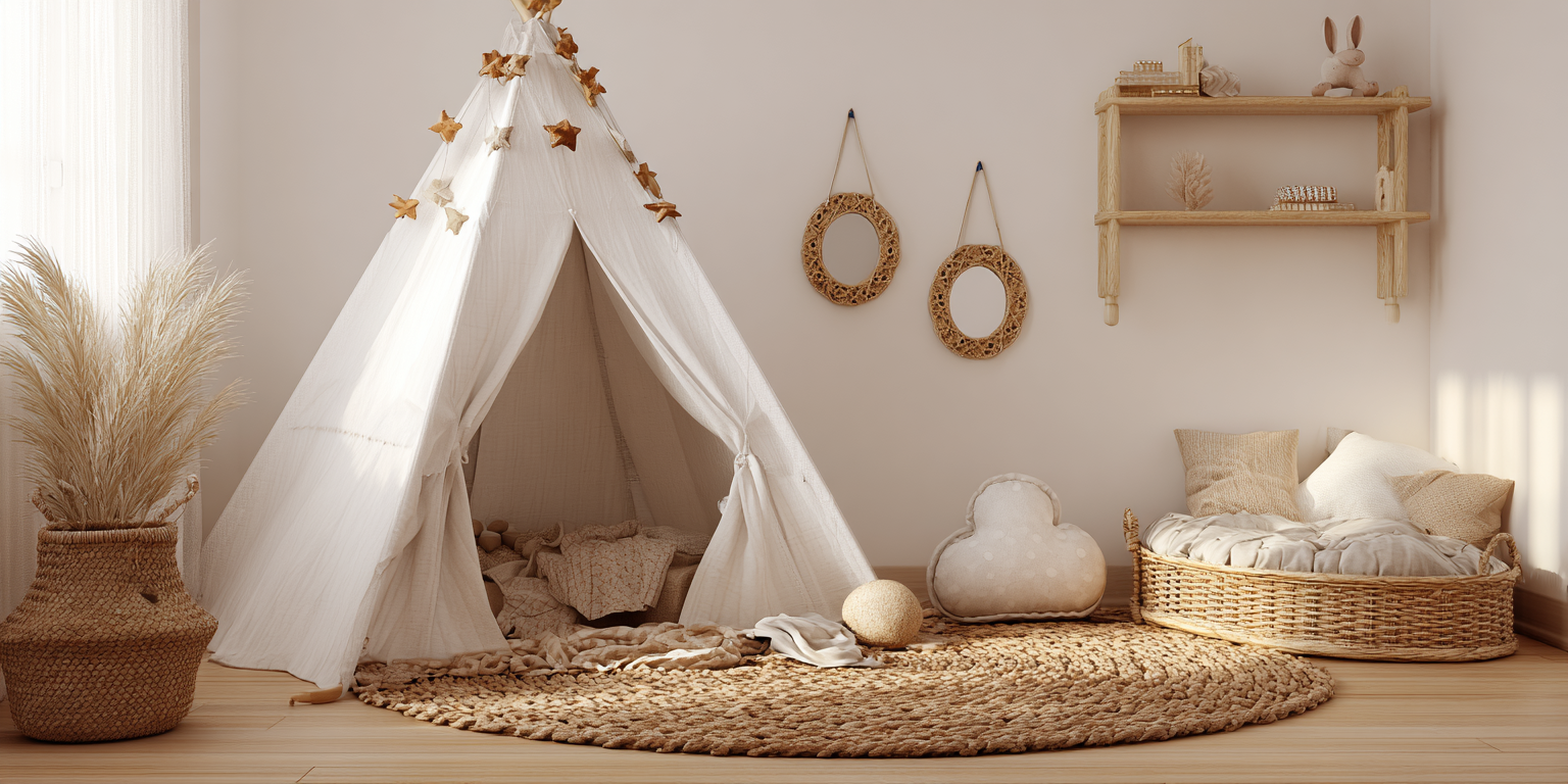 黄昏,这幅图描绘了一个舒适的儿童房,整体风格简单自然。房间的中心是一个白色的帐篷,以三角形的结构为特色,装饰着小的木制星星,增加了一种有趣和手工制作的感觉。帐篷下面铺着圆形编织的草毯,增强了自然的氛围。帐篷旁边放着一张小藤床,上面放着一个云状的枕头,显得柔软可爱。角落里放着一个藤制的储物篮,里面装着一些毛绒玩具,既实用又装饰空间。两个装饰着兔子耳朵的柳条镜子挂在房间的墙上,增添了一丝奇思妙想。在他们旁边放着一个织物收纳袋,里面装着玩具或衣服,既是方便的收纳方案,也是装饰元素。整个房间的配色以白色和自然色调为主,营造出明亮、开放、温暖的氛围。藤、木、织物等装饰元素的和谐结合,给房间带来舒适、自然的质感。