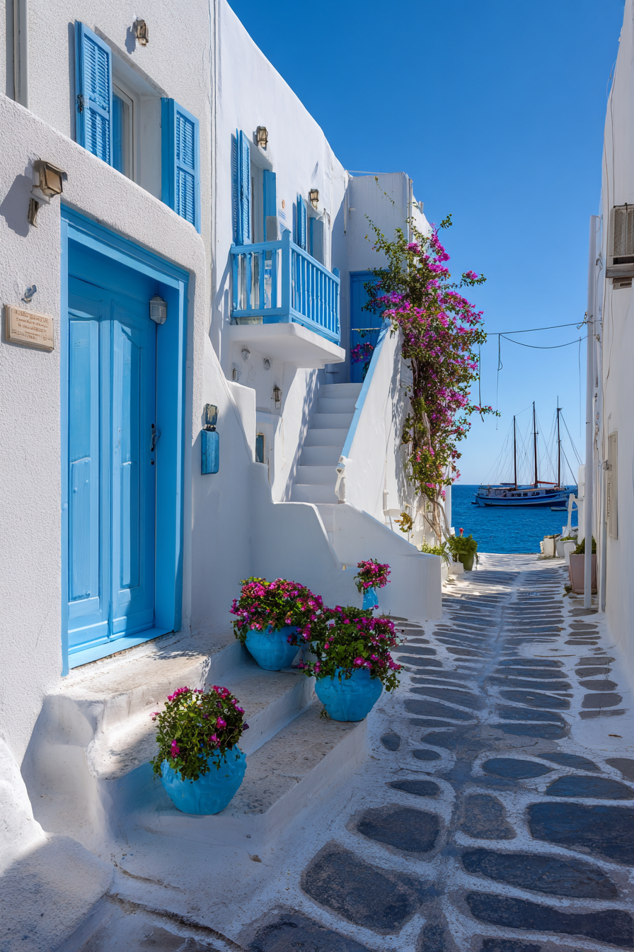 一条阳光明媚的希腊岛屿街道,白色的建筑,蓝色的门窗,鹅卵石街道两旁的花盆里盛开着鲜花,通往蔚蓝的大海,远处停泊着帆船。插图风格的特点是柔和的色彩,柔和的线条和平坦的色彩区域,唤起平静和夏日的共鸣。艺术品应该有一种复古的感觉,让人想起20世纪中期的旅行海报,并且没有任何文字或字母。