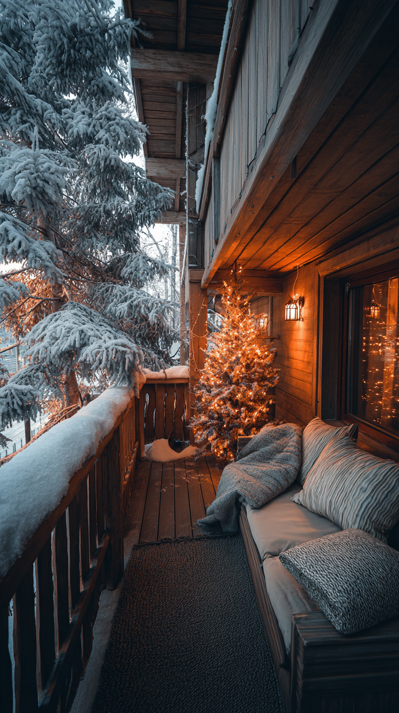 一个温馨的木质家庭住宅阳台在深冬,覆盖在柔软的雪逼真的拍摄。阳台设有质朴舒适的户外家具,配有温暖的毯子和枕头。角落里有一棵装饰精美的发光圣诞树,木栏杆上挂着一串串温暖的彩灯。从房子窗户散发出来的柔和、温暖的光芒照亮了这个场景。电影照明,体积光,超细节,8k,三分法,暖色分级。