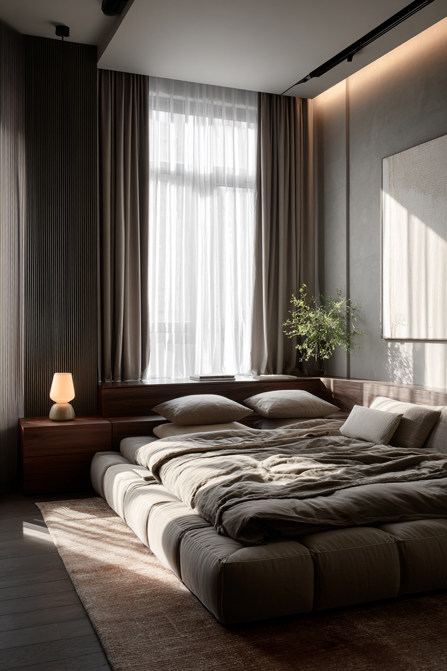 有机的现代卧室,温暖舒适的氛围,直米色软垫床,分层中性床上用品,深色胡桃木床头柜,柔和的环境照明创造柔和的阴影,柔和的复古地毯,质朴的泥土色调,简单的陶瓷台灯,在一个小容器中微妙的绿色植物,纯粹的灰褐色窗帘扩散自然光,床上方的极简主义框架墙艺术,干净的线条,忧郁的高架调色板,和平的亲密布局,高端编辑摄影,35毫米镜头。室内设计杂志美学
