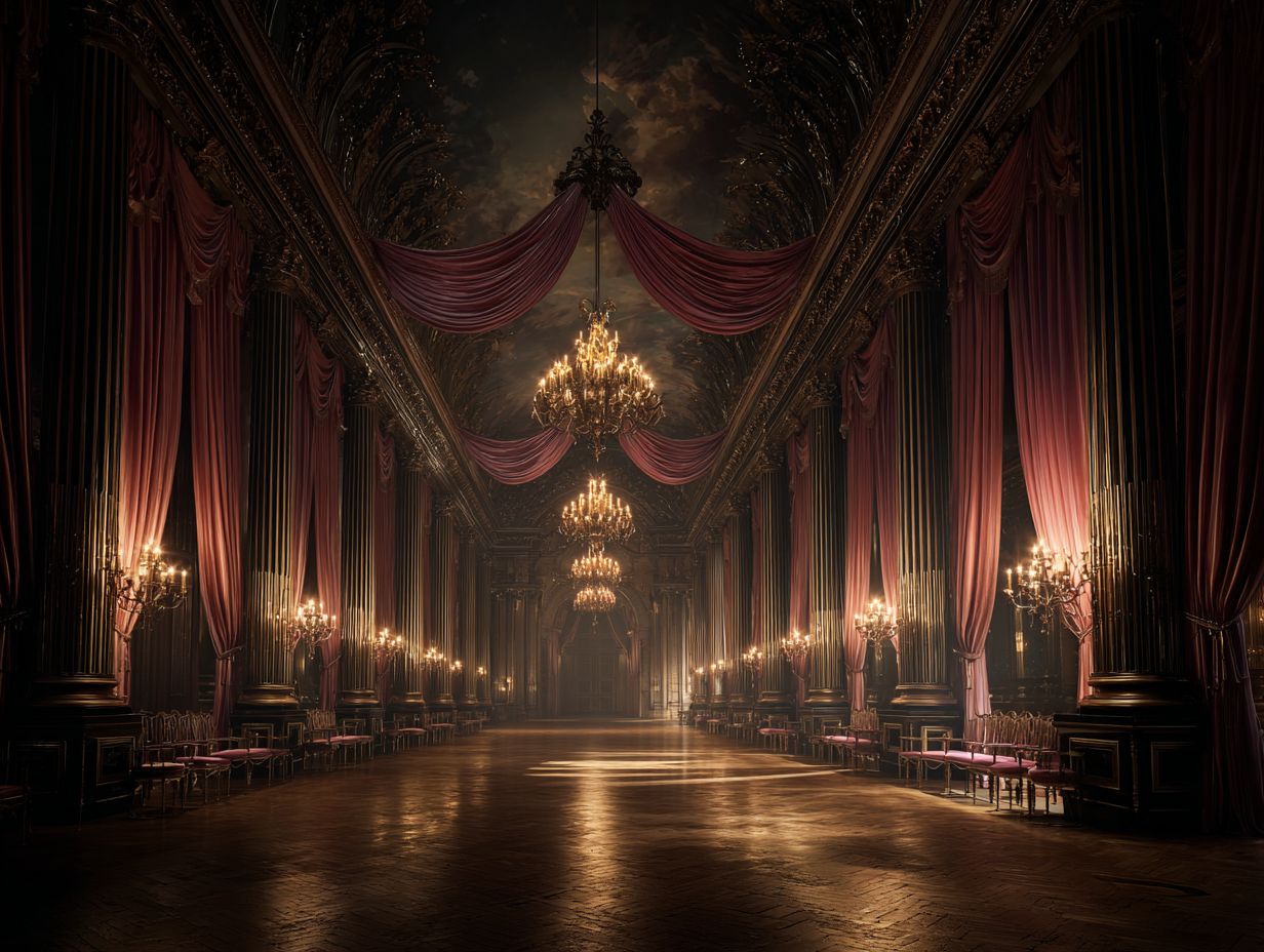 一个空旷的大型化装舞会舞厅,正面对称的构图,没有人,没有运动,华丽的欧洲宫殿内部,高耸的天花板,华丽的枝形吊灯温暖地发光,丰富的红色天鹅绒帷幔框架的空间,抛光木地板反射柔和的烛光,古典的建筑细节,忧郁的电影照明,深阴影和高光,优雅和虔诚的气氛,保密和曝光感,永恒的,安静的,庄严的,美丽的拍摄,超现实的,浅大气雾霾,胶片静止,35mm摄影,高对比度,温暖的金色和深红色色调,博物馆级的构图