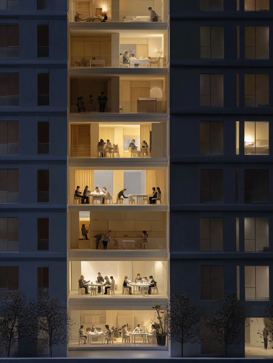 一栋现代公寓楼的横切面完美地切成两半,展示了多个楼层和公寓,玩具屋的视角,一些公寓被柔和的黄色灯光照亮,显示了一群朋友在里面,人们随意交谈,其他人围坐在一起读书时进行深入的交谈,另一个公寓与朋友们围坐在桌子旁吃饭,生活方式时刻分布在不同的楼层。剩下的公寓黑暗而空旷,关灯,照明和未照明空间之间的强烈对比,舒适而亲密的氛围,电影般的灯光,逼真的室内设计,城市建筑,夜景,讲故事的构图,高细节,深度和现实主义,柔和的阴影,超高分辨率,当代插图符合照片现实主义