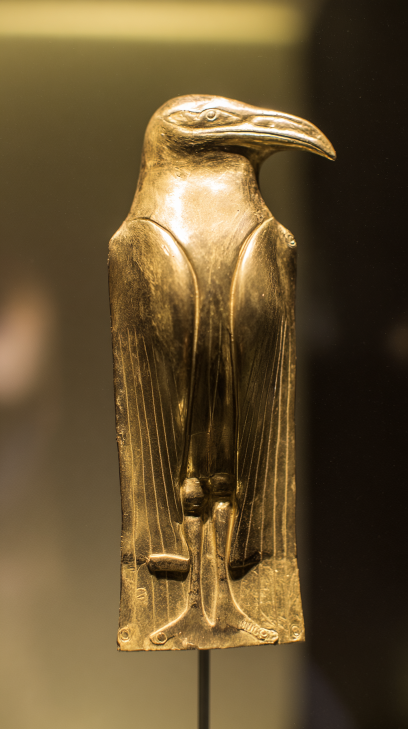 一只小金雕,正面对称。金属金表面,轻微磨损,手工制作外观具有明显的纹理和缺陷。不精致,不不朽,不英雄。雕塑是孤立的,清晰可读,漂浮或巧妙地悬挂,没有基座,没有底座,没有标签,没有牌匾,没有任何形式的文字。背景不是平坦的:垂直的色调渐变让人联想到比利时的天空,顶部较暗,中间过渡到柔和的中间色调灰色,底部变浅,微妙而大气,而不是戏剧化。雕塑上的高对比度照明:金色表面上强烈的镜面高光和深而明确的阴影,强调浮雕,体积和材料密度。平面,正面摄像头位置。博物馆文献美学,20世纪后期观念艺术的语境。强调象征主义、制度上的讽刺和克制的权威。摄影现实主义,分析距离,概念紧缩。