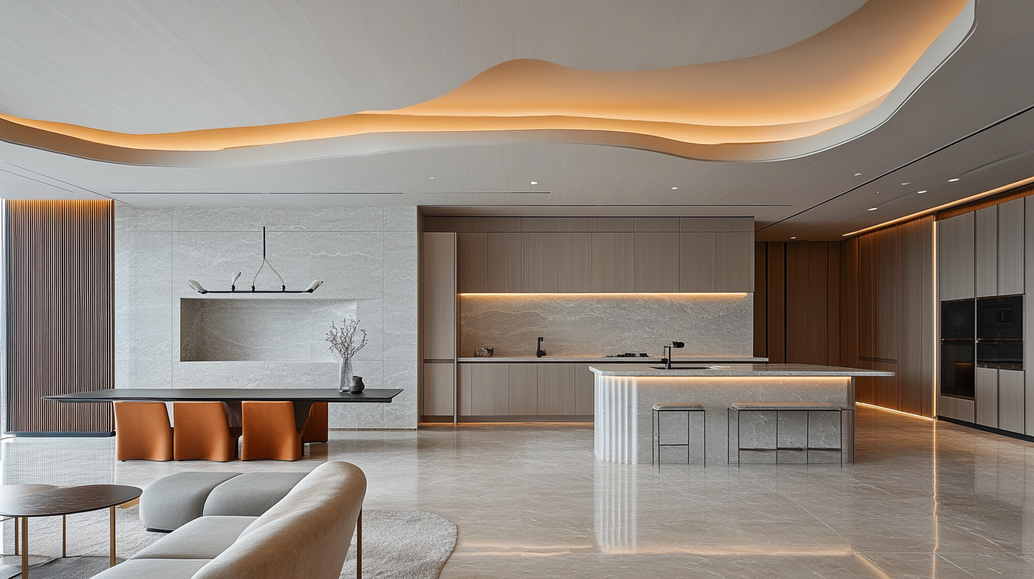 融合东方禅意与极简主义的奢华居住空间,采用流动的弧形天花设计引导视线,意大利进口磨砂大理石地面与日本桧木地板无缝拼接,营造材质的戏剧性对比。空间布局采用虚实相生的层次递进,悬浮式定制橱柜与隐形门系统打造纯净界面,FLOS艺术吊灯如雕塑般点缀用餐区域。色彩以象牙白、烟灰为主基调,搭配古铜金与胡桃木的温暖点缀,光影通过智能调光系统实现从晨曦微光到暮色柔和的渐变,墙面采用微水泥与丝绒布艺的肌理碰撞,整体呈现低调奢华的艺术生活美学。