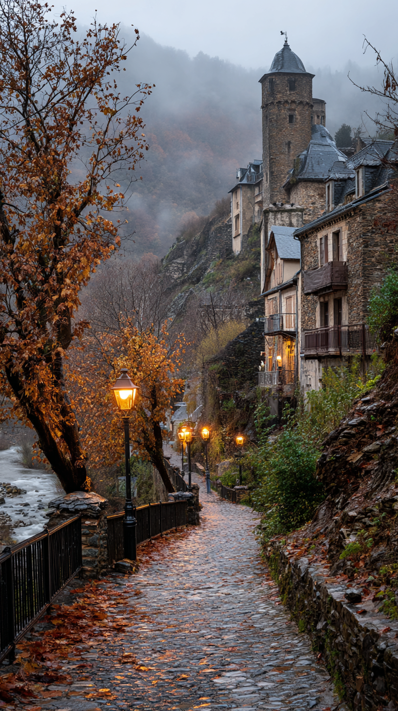 一个村庄里的河流和城堡的冬季场景,街道上的鹅卵石小路上有路灯,俯瞰着带有旧瞭望塔的石墙,上面是雾蒙蒙的雨天,捕捉树叶上灯笼和潮湿的石头地面发出的柔和光芒,在黄金时间拍摄,以突出温暖的色调,而下雨,营造出梦幻般的氛围。