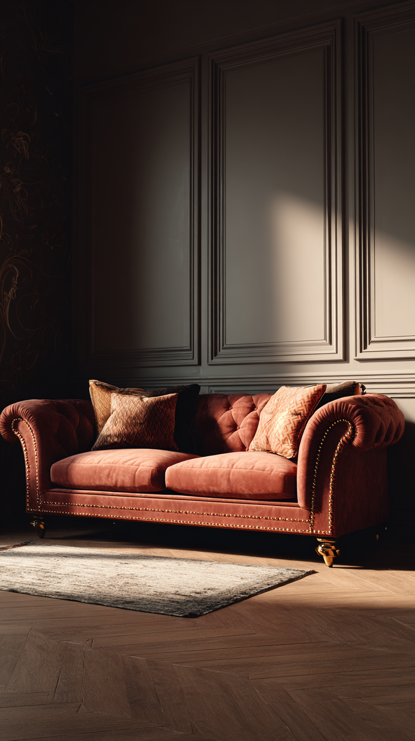 专为Instagram Reel设计的逼真室内场景,垂直构图,正面经典沙发完美居中,没有装饰枕头,没有扔,沙发上没有物体。内饰采用深温铁锈织物,丰富逼真的纺织质感,哑光饰面,微妙的自然阴影。优雅的传统轮廓与圆形的手臂和精致的黄铜钉头修剪。精致的内饰与温暖的陶土色调镶板墙,柔和的电影般的自然光从侧面,现实的深度和对比。木质地板,底部铺着一条柔和的老式地毯,几乎看不见。编辑室内设计摄影风格,超逼真,高端家具目录look,平视相机,浅景深,逼真色彩,8k写实,构图干净。没有插图,没有风格,没有家具上的艺术品,没有室内装饰上的图案,没有装饰枕头,没有文字,没有标志。Midjourney绘画设计。