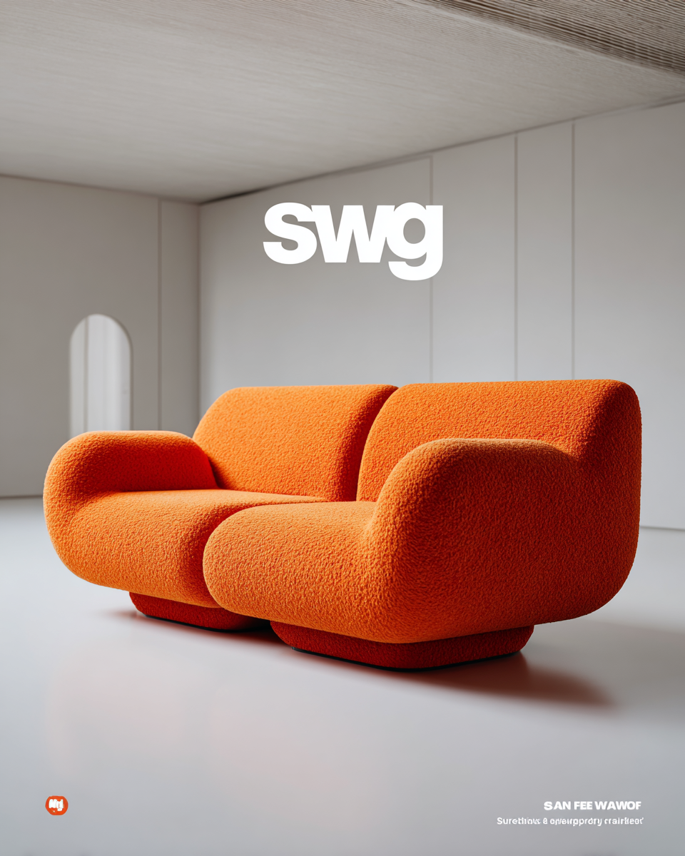 雕塑式的模块化沙发设计,充满活力的橙色纹理羊毛内饰,大胆的超大滚动扶手无缝过渡到低靠背,座椅由两个大块组成,具有弯曲的外部“气泡”边缘和完美的直平中心接缝,整体的地板环绕轮廓,隐藏的凹陷底座,极简主义前卫家具美学,工作室照明,干净的白色背景,8k分辨率,建筑家具摄影。