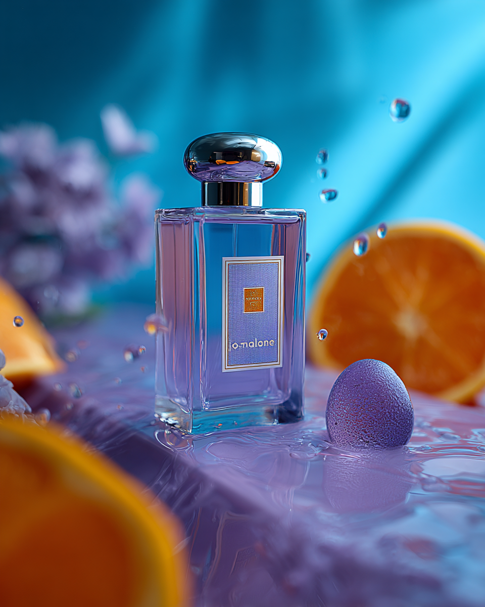 紫色的圆形讲台上放着一瓶“jo malone”香水,一个蛋形的球和玻璃珠漂浮在它的前面。背景以淡蓝色水滴和淡橙色水滴为特色,营造出一种强调细节的极简风格。光线柔和、饱和度高、对焦清晰、质感细腻、水波纹、商业摄影。产品以特写视角呈现,呈现出清新的色彩