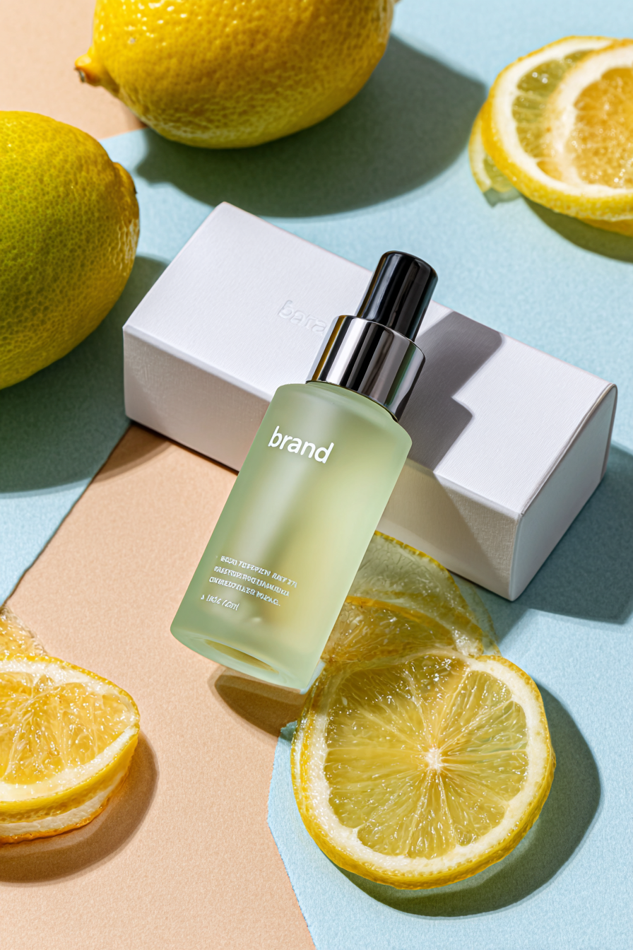 一瓶淡绿色的液体面部精华液,黑色滴管顶部放在一个打开的白色和柠檬主题的盒子上,品牌名称“brand”用浅灰色的字母写在它的一侧,几片新鲜的柠檬躺在精华液包装周围,背景颜色应为柔和的粉彩蓝色和米色,产品摄影,分辨率高,美观。
