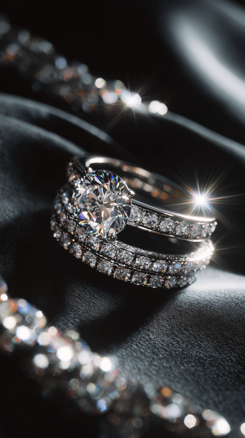 奢华的钻石戒指漂浮在半空中,没有可见的支撑,超高细节的珠宝,铂金带复杂的钻石铺路设置,大型明亮切割钻石,反射和折射美丽的光,创造迷人的火花和动态光游戏,超现实主义,电影般的光芒,黑暗丝绸般的背景,戏剧性的工作室照明,超高清,8K,逼真的渲染,令人惊叹的反射和耀斑