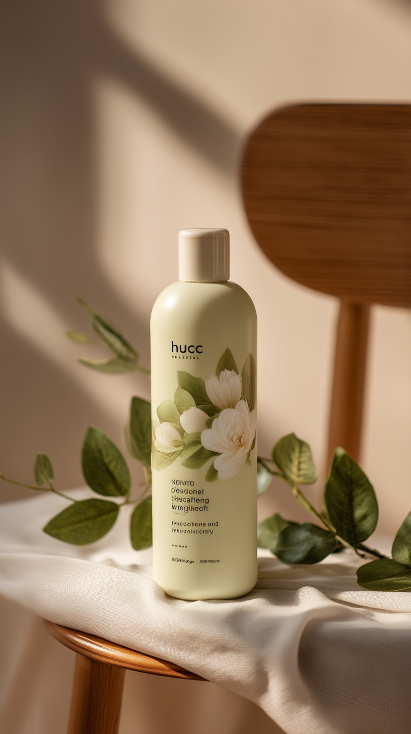 一瓶来自“hucc-stack”品牌的沐浴露,绿色的花朵和薄树叶,在白色的布上,旁边是一个优雅的木凳,浅色的背景,极简主义的风格,现代摄影,产品摄影,工作室灯光,柔和的阴影,中性的色调,高分辨率,超现实的细节,焦点模糊效果,底部的文字写着“国际环境遮挡”。Midjourney绘画实现电商产品设计效果。