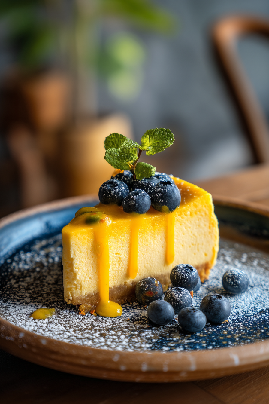 美食摄影:一块芒果奶油蛋糕放在日式手工陶瓷盘子上,上面点缀着两个新鲜的蓝莓和芒果丁。黄色的芒果汁从蛋糕上滴到盘子里,糖粉撒在蓝莓上和盘子周围,新鲜的薄荷叶散落在整个蛋糕上,使蛋糕看起来充满活力和诱人。背景是一家高端工业风格的咖啡馆。尼康D850相机,俯拍,45度角,柔和自然光,特写,微距。高分辨率。