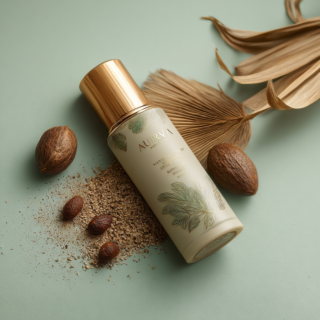 为发油品牌AUREVA设计的朴实奢华的前标签,amla和茴香种子柔和地展示,中性的象牙色背景,橄榄绿和柔和的金色口音,最小的植物设计,优质衬线字体,阿育韦达风格的现代奢华包装,平静而优雅的美学