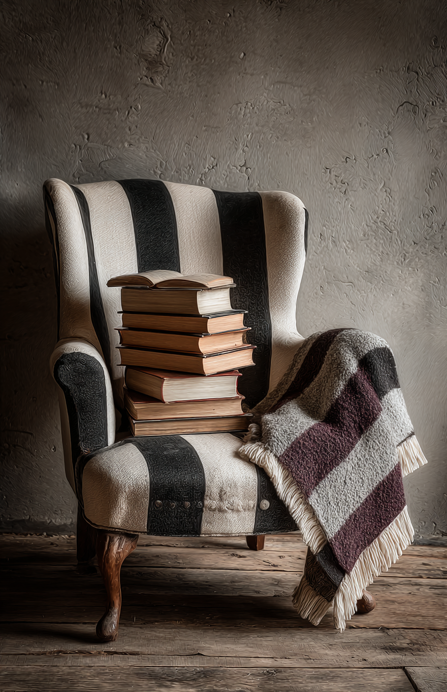 一张黑白条纹的扶手椅上放着一摞书,上面盖着一条大卫·霍克尼风格的毯子。这幅画的特点是柔和、中性的色调,用油画颜料和可见的笔触绘制,创造了一种绘画式的、现代的、极简主义的、古怪的审美。高分辨率、详细的插图精确地捕捉了场景。