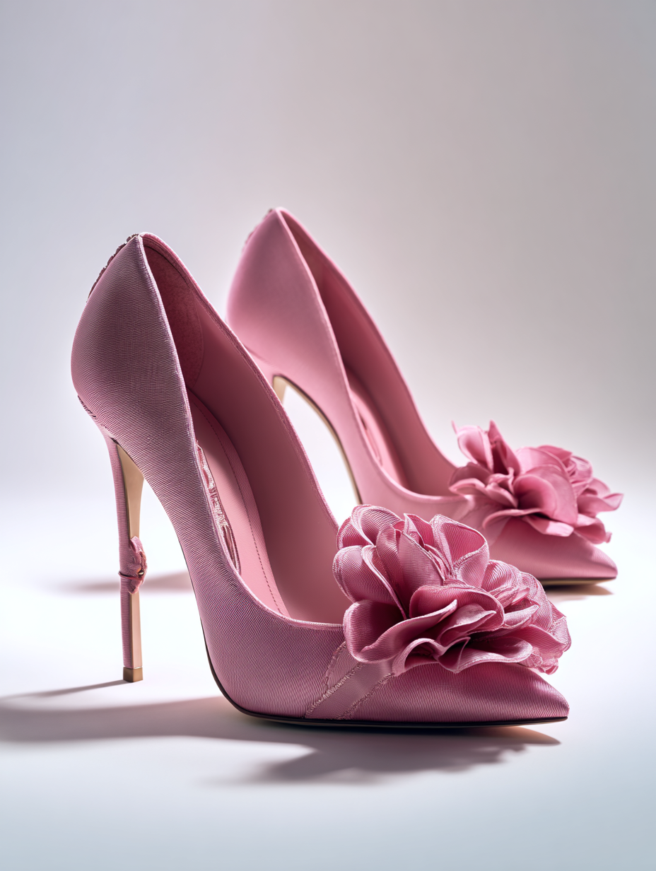 这张图片是一双粉色高跟鞋的数字插图。一个非常详细,逼真的插图,一双优雅的粉红色高跟鞋与大,豪华的蝴蝶结。鞋跟又高又细。每只鞋的脚趾盒上都有一个突出的蝴蝶结,脚踝周围有一个大的装饰性蝴蝶结,都是用同样的缎面面料制作的。这双鞋并排放置在纯白色的背景下,强调了它们精致、女性化的设计和柔和的粉色。灯光突出了缎面的光滑质感和蝴蝶结的复杂褶皱,创造了一种精致而时尚的美感。