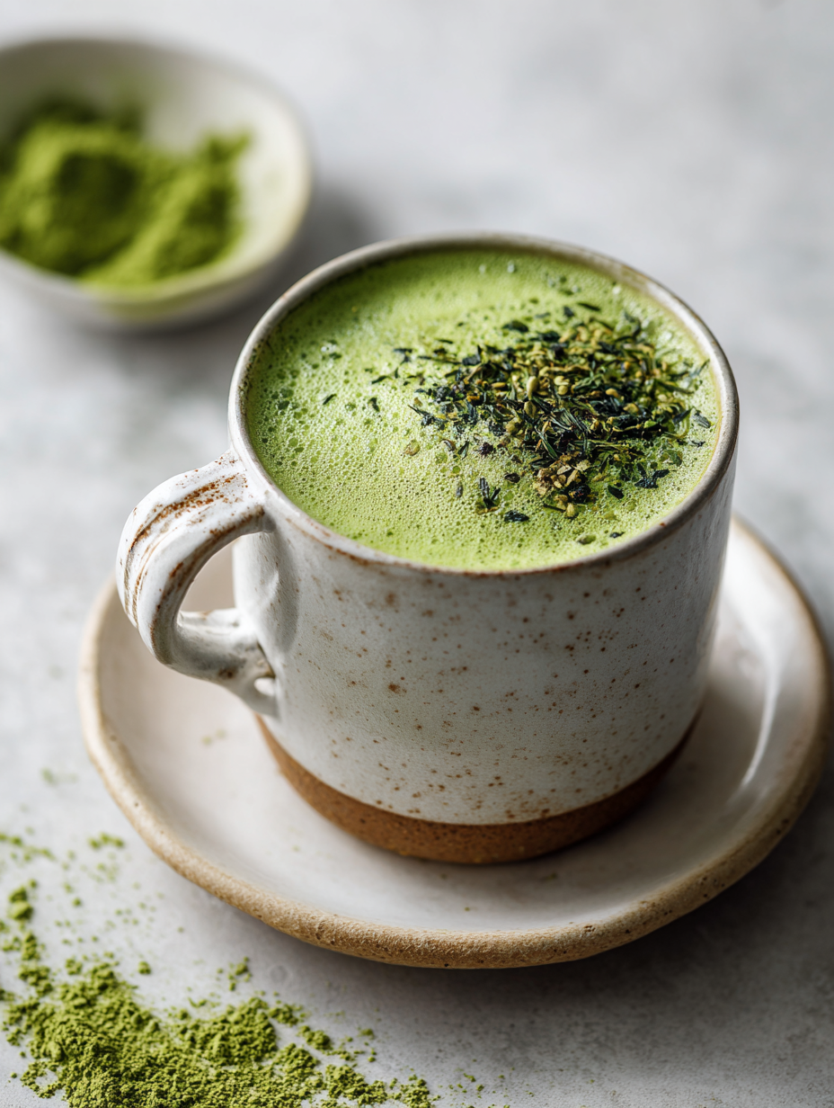 一个逼真的图像大豆抹茶和燕麦牛奶抹茶产品使用的形状的奥斯韦尔传统亚洲饮料瓶。肯定有抹茶粉,大豆和燕麦牛奶。瓶子放在一个圆形的陶瓷杯垫上,放在一张轻便的大理石桌子上。柔和的自然光。背景是干净和最小的。高细节,超逼真的纹理。MJ绘画提示词如下: