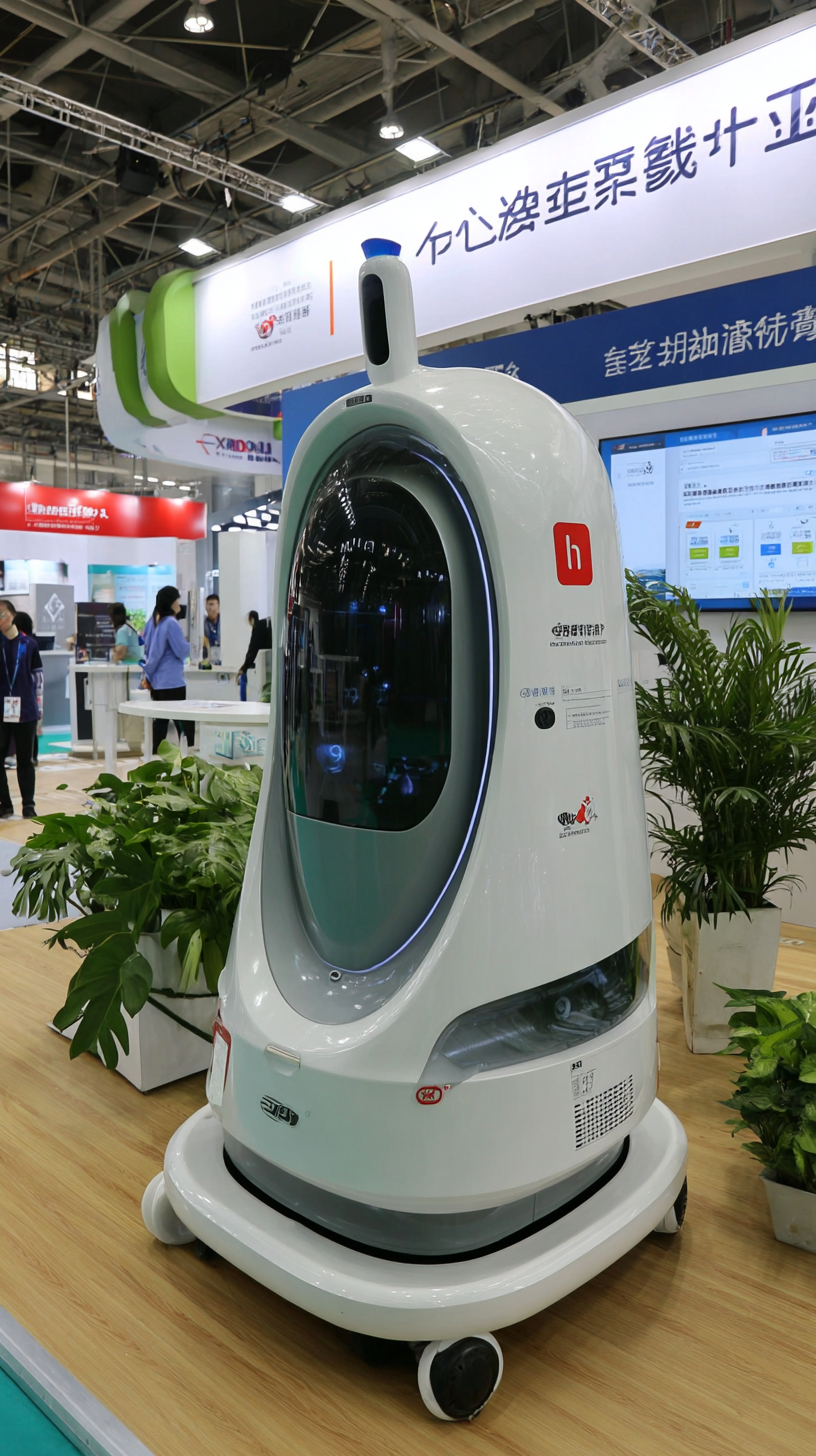 未来感十足的机械兔子,有机流畅的曲线,光洁的珍珠白合成表面,无缝接头,内部柔和的LED发光,高端工业设计,3D渲染,极简的科技美学。全身站立,手持金属红色复活节彩蛋,上面写着“复活节快乐”的可爱机器人。