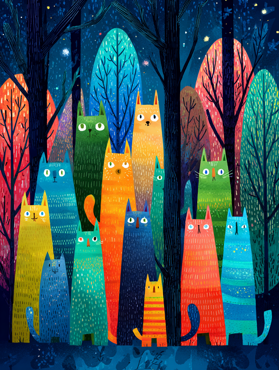 一个异想天开的森林场景,有各种颜色和图案的猫,周围是有彩色条纹或圆点的树木。背景是深蓝色,营造出一种让人想起20世纪60年代卡通风格的氛围。一群好奇的小猫站在一棵树前,为它增添了俏皮的魅力。这个艺术品将是完美的儿童书籍或墙壁艺术。它具有明亮的调色板,矢量插图,卡通风格,高分辨率和高细节。