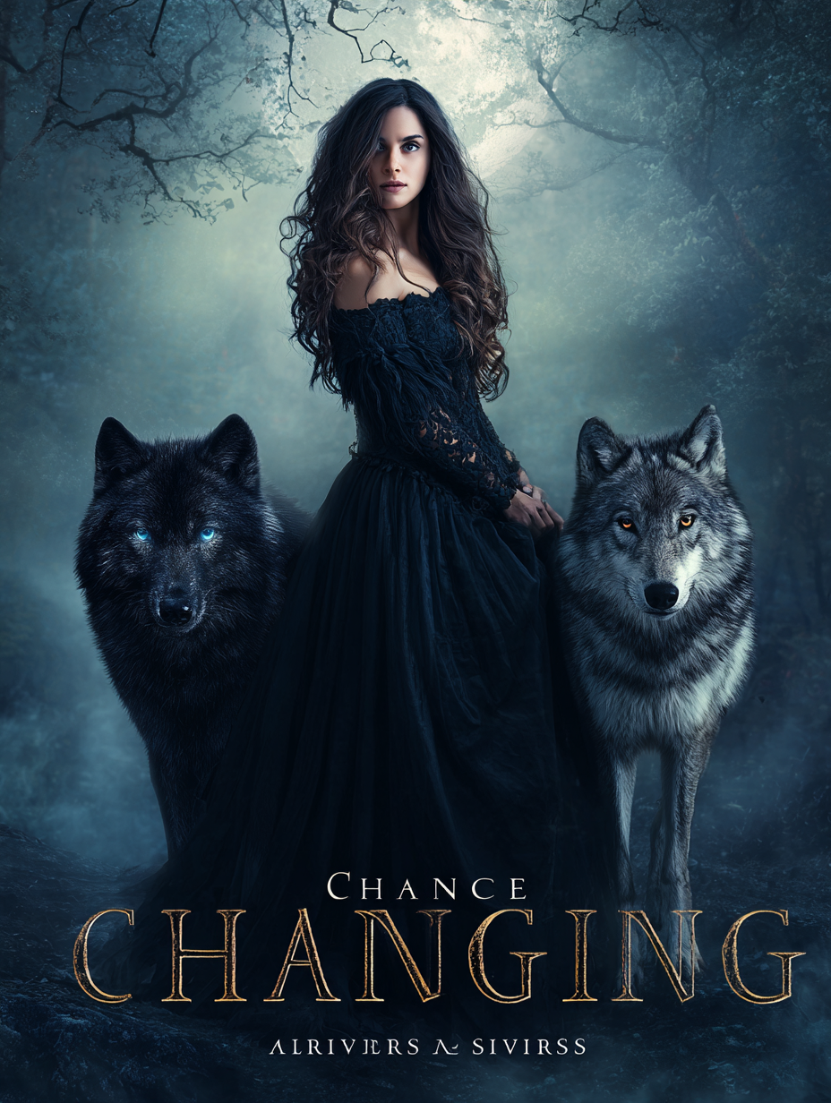这是一本黑色奇幻小说的封面,描绘了一个神秘而美丽的女人站在朦胧的森林里的新月下。她有一头长长的、波浪状的黑发,白皙的皮肤,一双炯炯有神的眼睛,穿着一件优雅的深领口黑色礼服。在她身边站着两只威严的狼,一只黑色的蓝眼睛,散发着力量和神秘,另一只灰色的琥珀色眼睛,显示出忠诚和智慧。背景是旋转的薄雾,月光透过乌云和光秃秃的树枝,营造出一种空灵而忧郁的氛围。书名《改变的命运》以优雅的金色衬线字体出现,下面用小字写着作者的名字“艾丽西亚·s·里弗斯”。整体基调是戏剧性的,浪漫的,超自然的,融合了美丽,危险和魔法。风格关键词:现实主义,电影灯光,奇幻现实主义,细节皮毛纹理,月光色调,大气深度,神秘色调,专业书籍封面设计。
